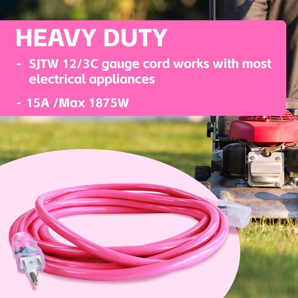 Pink Extension Cord 50 FT - 15 amps, 125 volts, 1875 watts, 5-15P/R. Thicker insulation heavy duty extension cord 12 awg ensures efficient power delivery without voltage drops, suitable for high-power appliances and tools. Whether you're running a lawnmower, hedge trimmer, or connecting multiple Christmas light strands, our cord provides the necessary strength and stability,Lighted End 12 Gauge Extension Cord - LED indicator lights up when the extension cable is powered to let you know the triple tap extension cord is ready to use and easy to be found in the dark. Perfect for your household appliances, generator, HEV, DIY electric tools, lawn mower, pressure washer, pressure washer, Christmas and Spooky Halloween light system,Indoor/Outdoor Power Cord - Temperature Range: -40F to +140F, flexible vinyl jacket protects electrical extension cords against moisture, abrasion and direct sunlight. The appliance cord can endure extreme weather conditions, ranging from blistering hot summers to freezing winters. You can rely on its durability and resilience. The PVC casing of the extension cord is waterproof. Please note that the plug connection must remain dry during use,Safe Cable - ETL certified. Safety is paramount. 3-prong grounded plug that enhances safety by reducing the risk of electrical shocks and ensuring a secure connection. Reinforced blades further reinforce durability of the outdoor electrical cords,Customer Satisfaction Guaranteed - We stand behind the quality and performance of our extension power cord. With a commitment to excellence, we ensure that our extension cable meets stringent standards and exceeds expectations, providing you with peace of mind and reliable power wherever you need it most