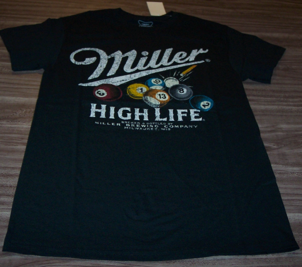 This is a VINTAGE STYLE MILLER HIGH LIFE BEER Billiards T-shirt. It is a Size SMALL and is NEW with the tag. It is 17 inches from armpit to armpit and 28 inches in length. The print is made to look Vintage. Combine auctions to save on shipping. AD
