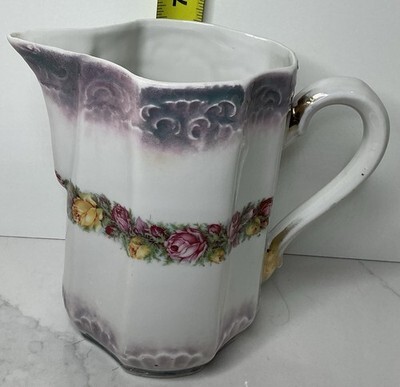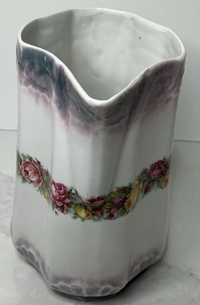 This vintage Diamond Shaped Victorian Pitcher features a beautiful blue and purple luster trim with yellow roses, adding a touch of elegance to any kitchen or collector's display. Made of porcelain and hand-painted, this medium-sized pitcher has a unique diamond shape and a floral pattern that reflects the Victorian style. With a height of 6.5 inches and a diameter of 3.5 inches, this original piece includes a handle for easy carrying. Perfect for those who appreciate vintage decor and Victorian-era aesthetics, this pitcher is a charming addition to any collection.