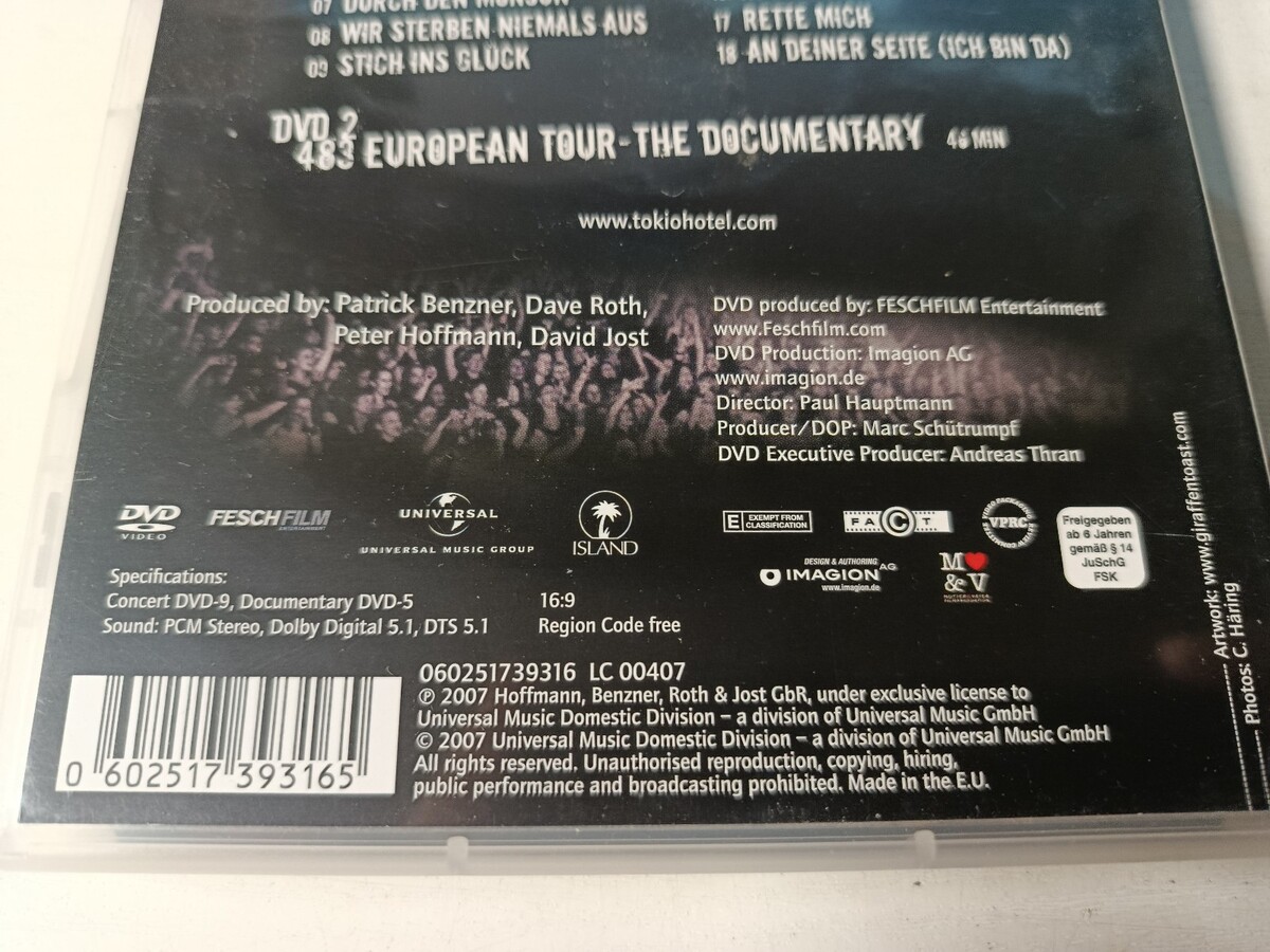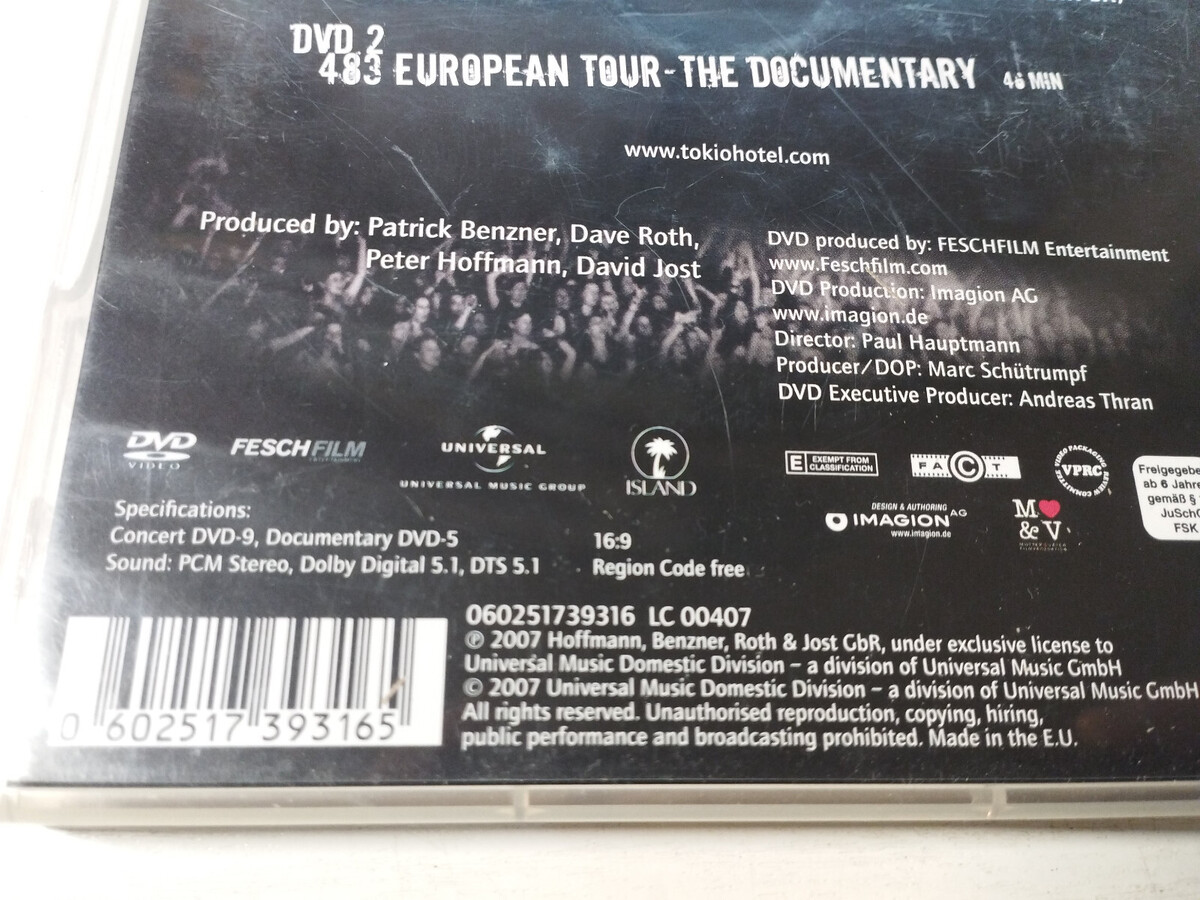 Official European edition released by Universal Music Group in 2007 con de 602517393165. Contains dos DVDs: el first includesel full concertde the Zimmer 483 tour, recorded livecon an approximate durationde 93 minutes. el second disc offers el documentary 483 European Tour The Documentary, con exclusive images, interviews and scenesdel backstage. Original presentation con illustrated interior booklet, de photographs and full creditsde production. An essential edition para losde Tokio Hotel andpara collectorsde Music DVDs. Contains uno delos most powerful concertsde the band in its stagede greatest international success, togetherconun ideal exclusive documentarypara those who want a closer view de their European tour. Attractive presentation, complete material and de quality sonidocon PCM S