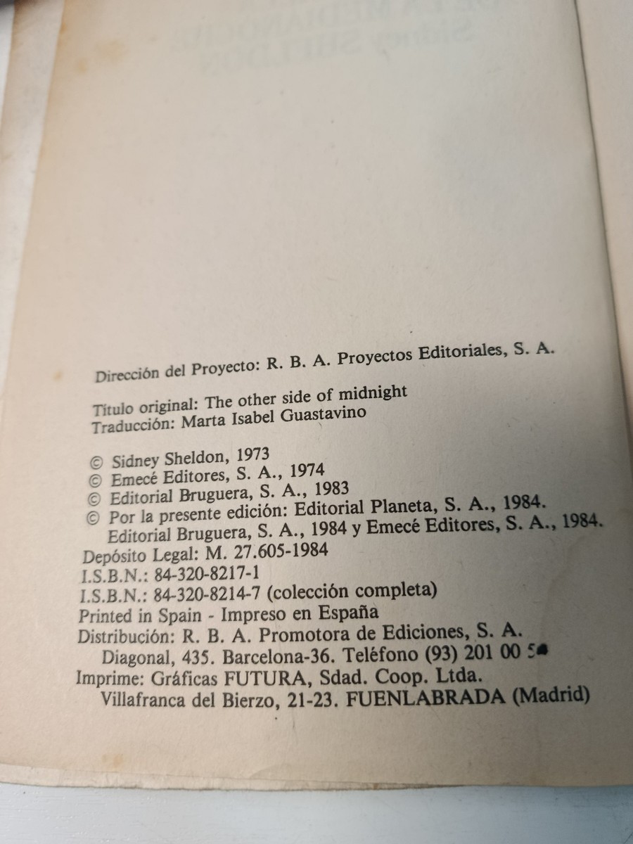 Mas Alla de la Medianoche Sidney Sheldon (Planeta 1984) - LIBRO Español