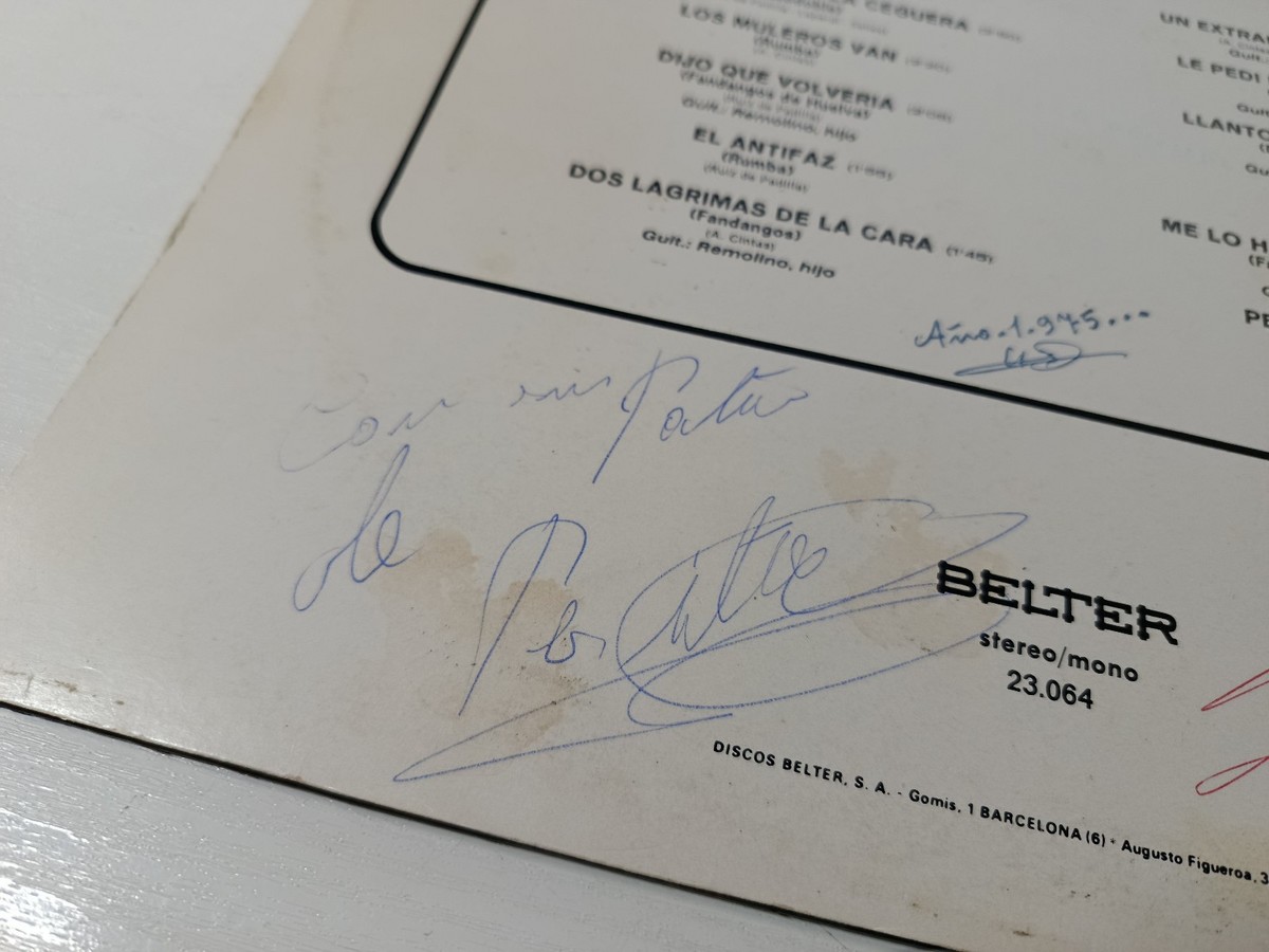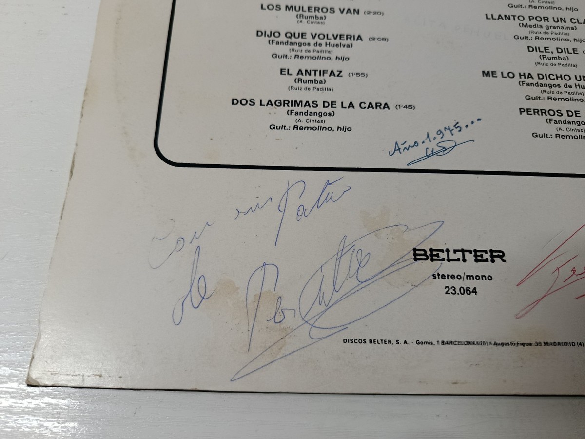 Original 1975 Belter edition, one of Perlita de Huelva?s most emblematic recordings. This copy includes a remarkable collectible feature: hand-signed by Perlita de Huelva on the back cover in blue and red ink.