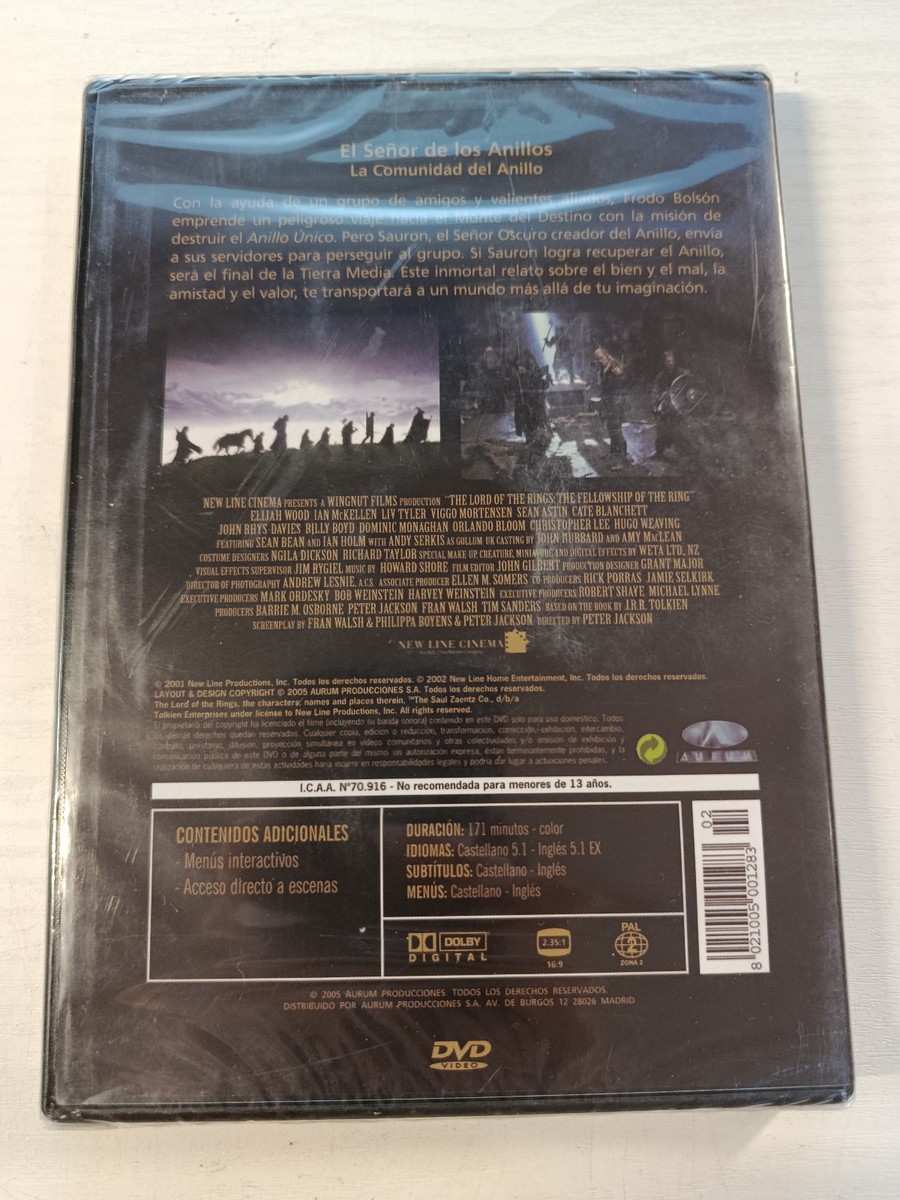 Original DVD edition de el señor de los anillos: The Fellowship del Ring, new and sealed. Includes menus and subtitles in Spanish and English, Dolby Digital 5.1 sonido and direct access to scenes. Ideal para collectors or lovers de the trilogyde peterJACKSON based on the workde Tolkien.