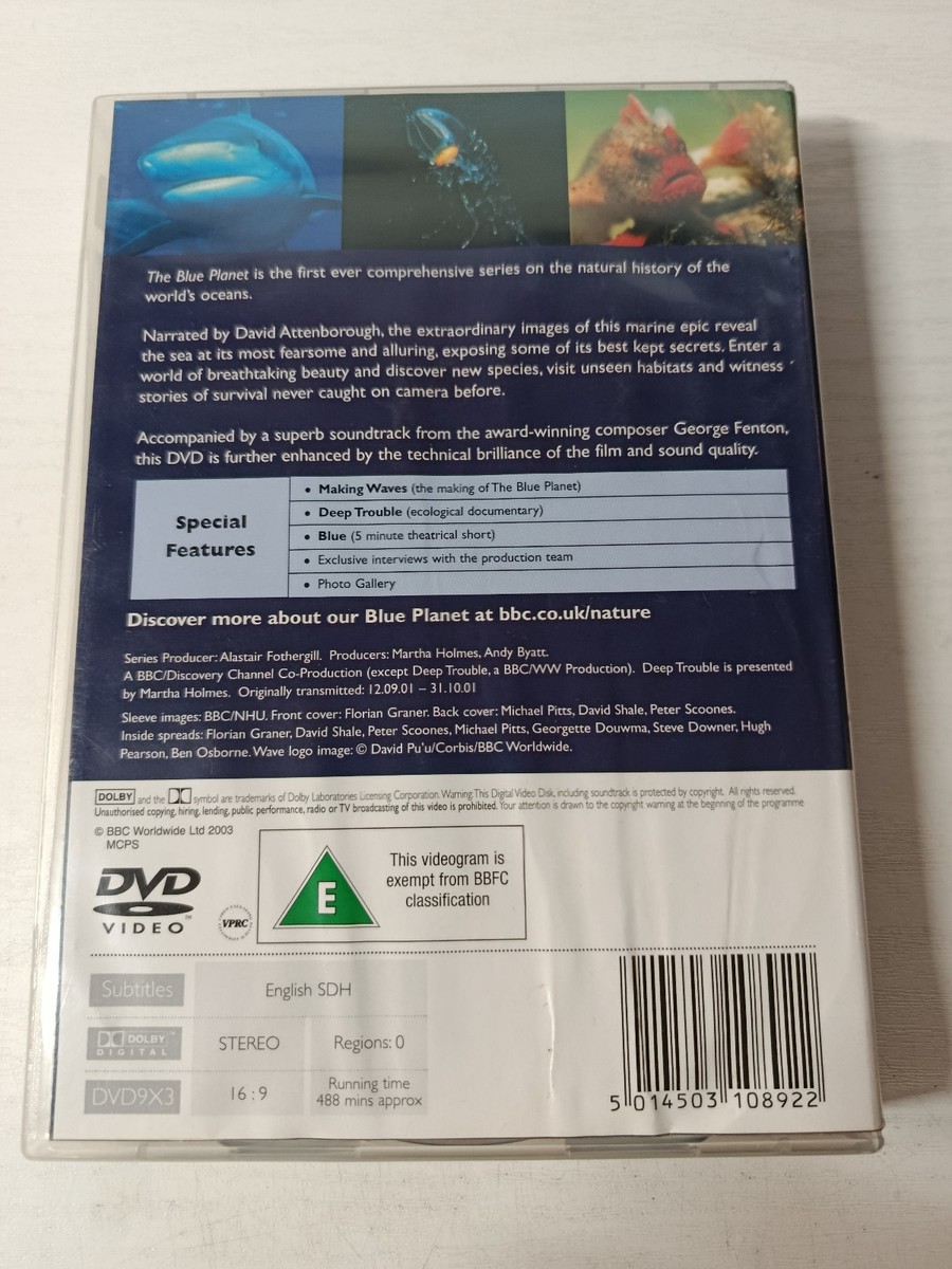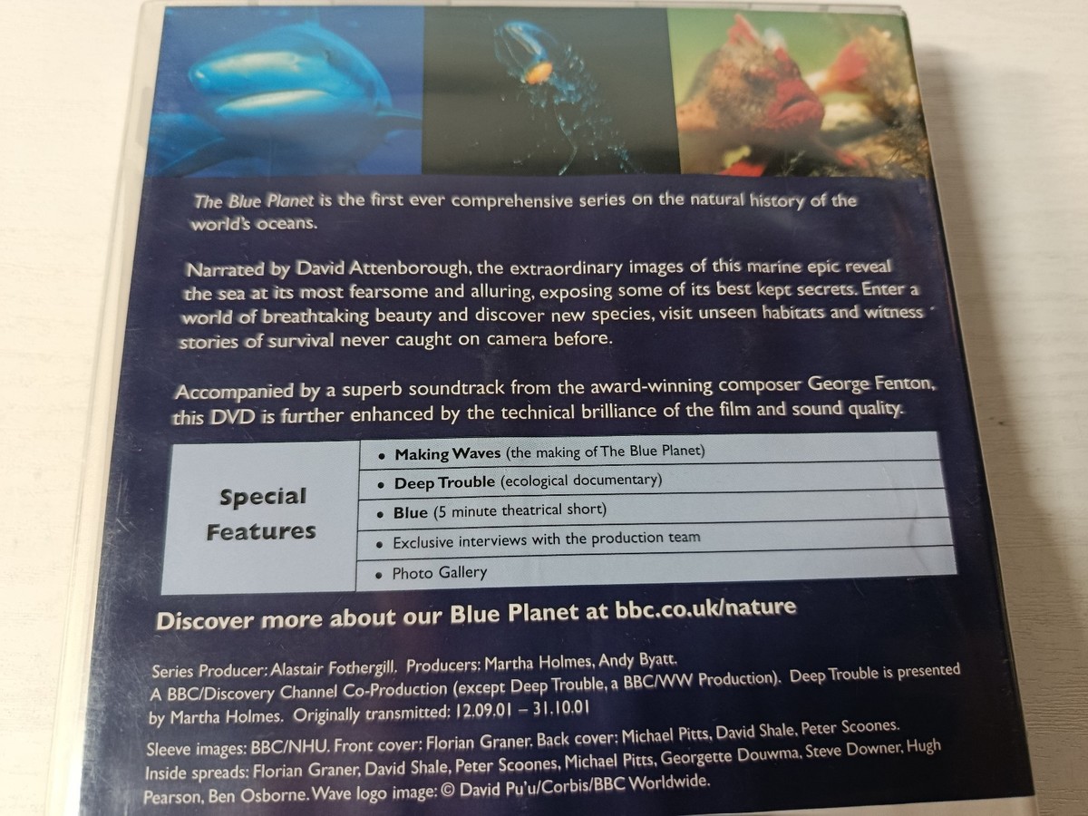 Offizielle BBC-Ausgabe de berühmten Dokumentarserie mit Sprecher David Attenborough, die sich der Erforschung los Ozeane widmetdel Planetcon spektakulare Bilder undun einzigartiger wissenschaftlicher und informativer Ansatz. Enthalt los drei Discs con allemlos Episoden undun umfangreiche Zusatzinhaltecon Dokumentationen, Interviews und Material dahinterde die Kameras. Box und Scheiben in gutem Allgemeinzustand, funktionieren einwandfrei.