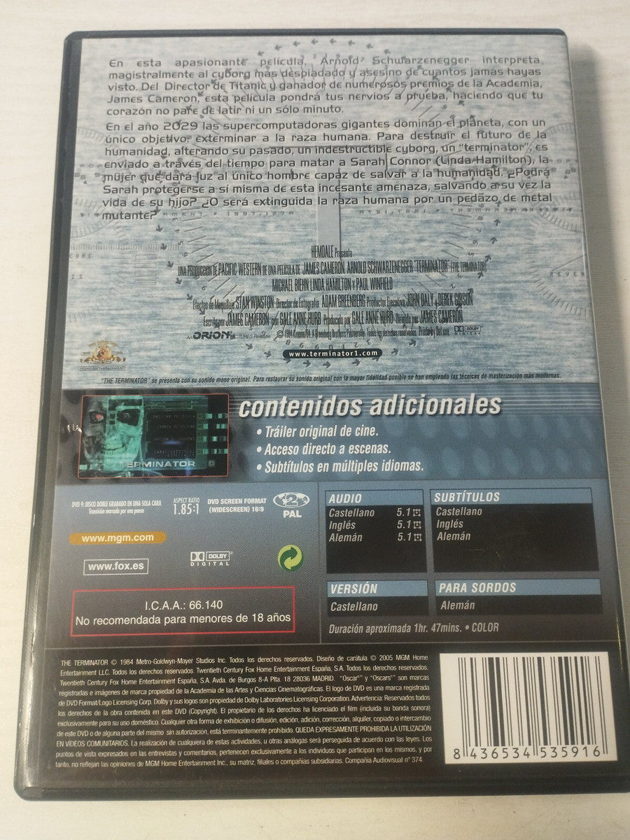 DVD Terminator, The Terminator, Arnold Schwarzenegger, James Cameron, ciencia fiction classique, film de , DVD collector, Skynet, T-800, cinema des annees 80, edition espagnole et anglaise, DVD region 2, science-fiction classique, cinema retro