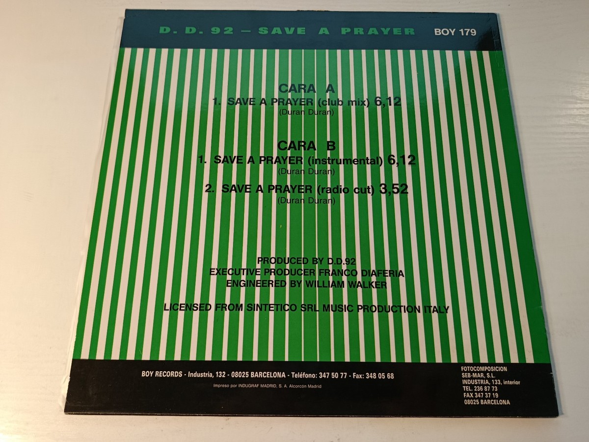 DD 92, Save A Prayer, Boy Records, 1993, Italo Disco, Eurodance, couverture de Duran Duran, Ginger Music, Club Mix, vinile 12 pouces, maxi single, dance 90s, vinyle rare, Barcelone, Franco Diaferia, collection electronique