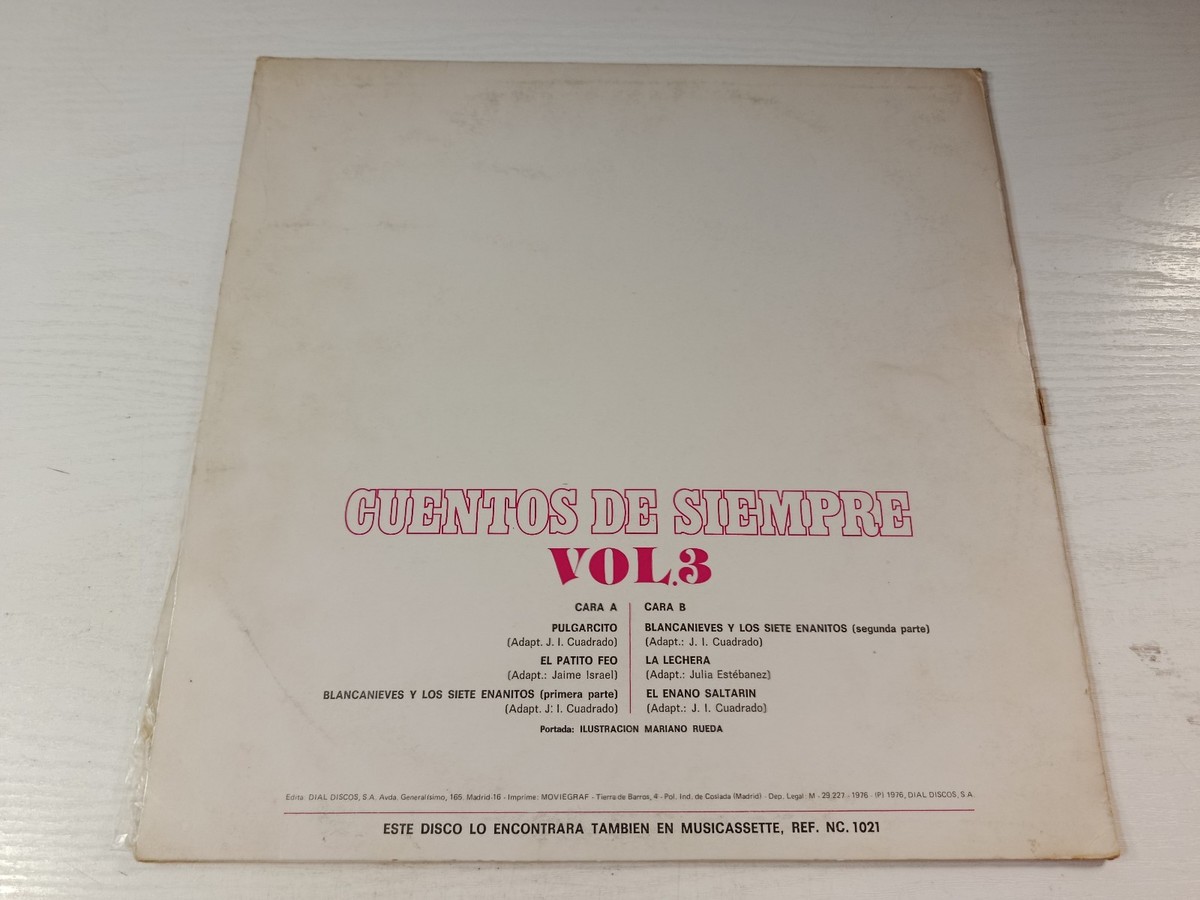 This volume 3 de the " cuentos collectionde Always "includes narrated adaptationsde Children's classicscomo Thumb, el PATITO FEO, Lechera either blancanieves and los siete dwarfs. Spanish production con de illustrationde Mariano Rueda. Narration in Spanish. Includes music and sound effects. Posted by Dial Discs in 1976. el Disco was also edited in Cassette format.