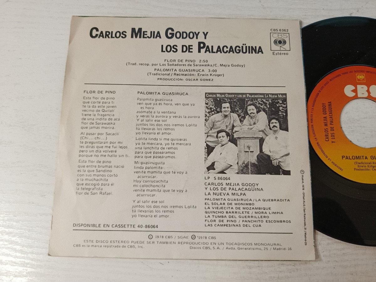 Publication originale en Espagne de 1978 bajoel jointCBS , ce single comprenddos themes representatifsdel repertoire nicaraguayen traditionnel et revolutionnaire. "Flor de Pino" et "Palomita Guasiruca" combinent elfolklore populairecon engagement social. El Le disque comprend les paroles completes imprimees sur la couverture arriere. Extrait del album "La Nueva Milpa" (LP S 86064), egalement disponible en cassette (40-86064). Un temoignage musical del mouvement revolutionnaire et culturel de Nicaragua. Ce single capture el esprit combatif et poetique deCarlos Mejía Godoy et songrupo ,Losde Palacagüina, adoscanciones que traverse la tradition oraleconelmensaje sociale. Perfecto para collectionneurs de musique latino-americaine, editions deCBS ou des disquescon contenu politique et culturel.