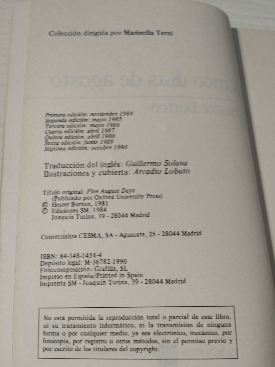 Cinco Dias de August Hester Burton SM de 1990 - LIVRE Espagnol Am