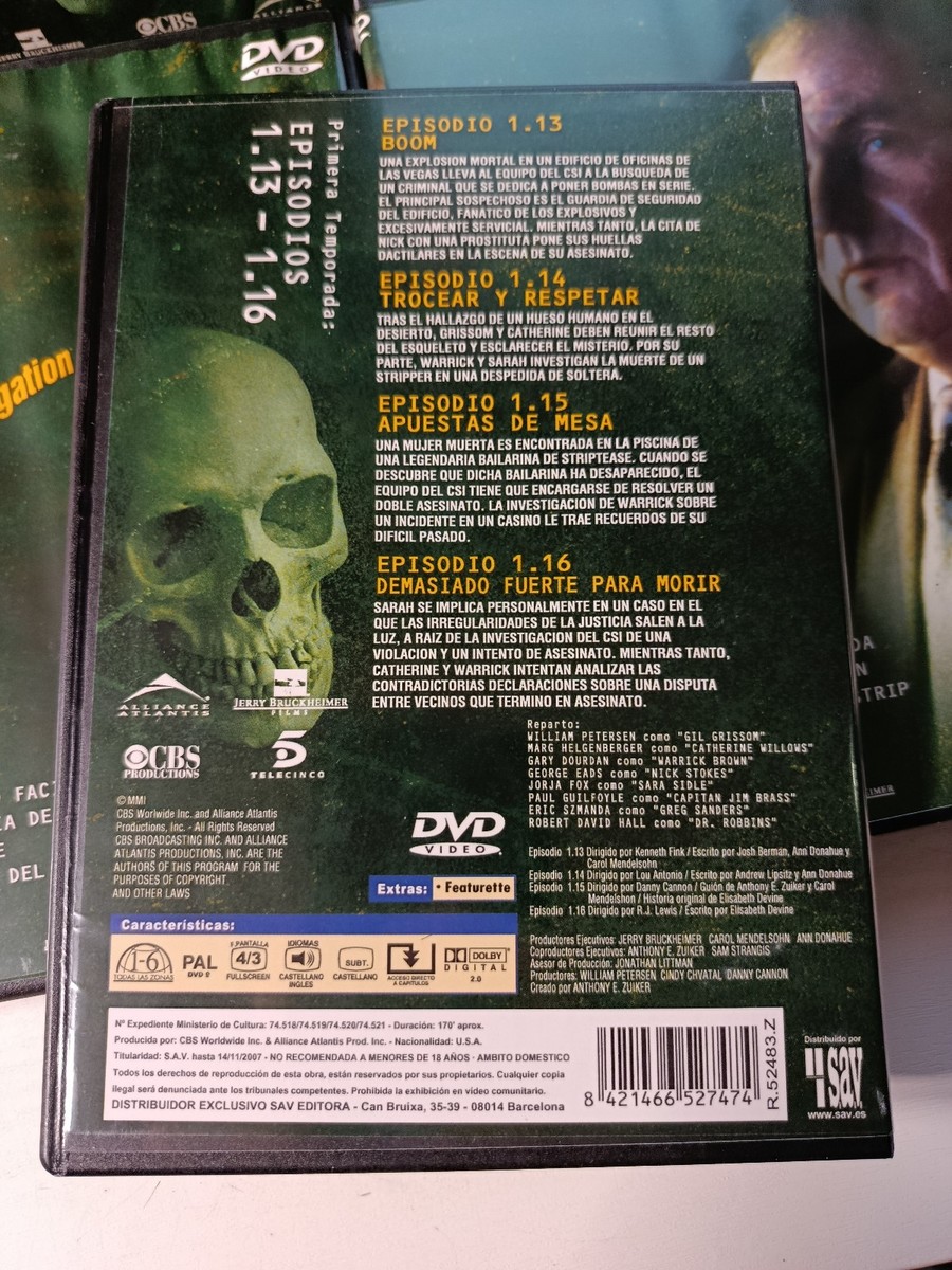 CSI Las Vegas season 1, CSI first season DVD, episodes 1.13 1.23, forensic series, CSI collection, William Petersen, SAV Ediciones, DVD region 2, classic police series