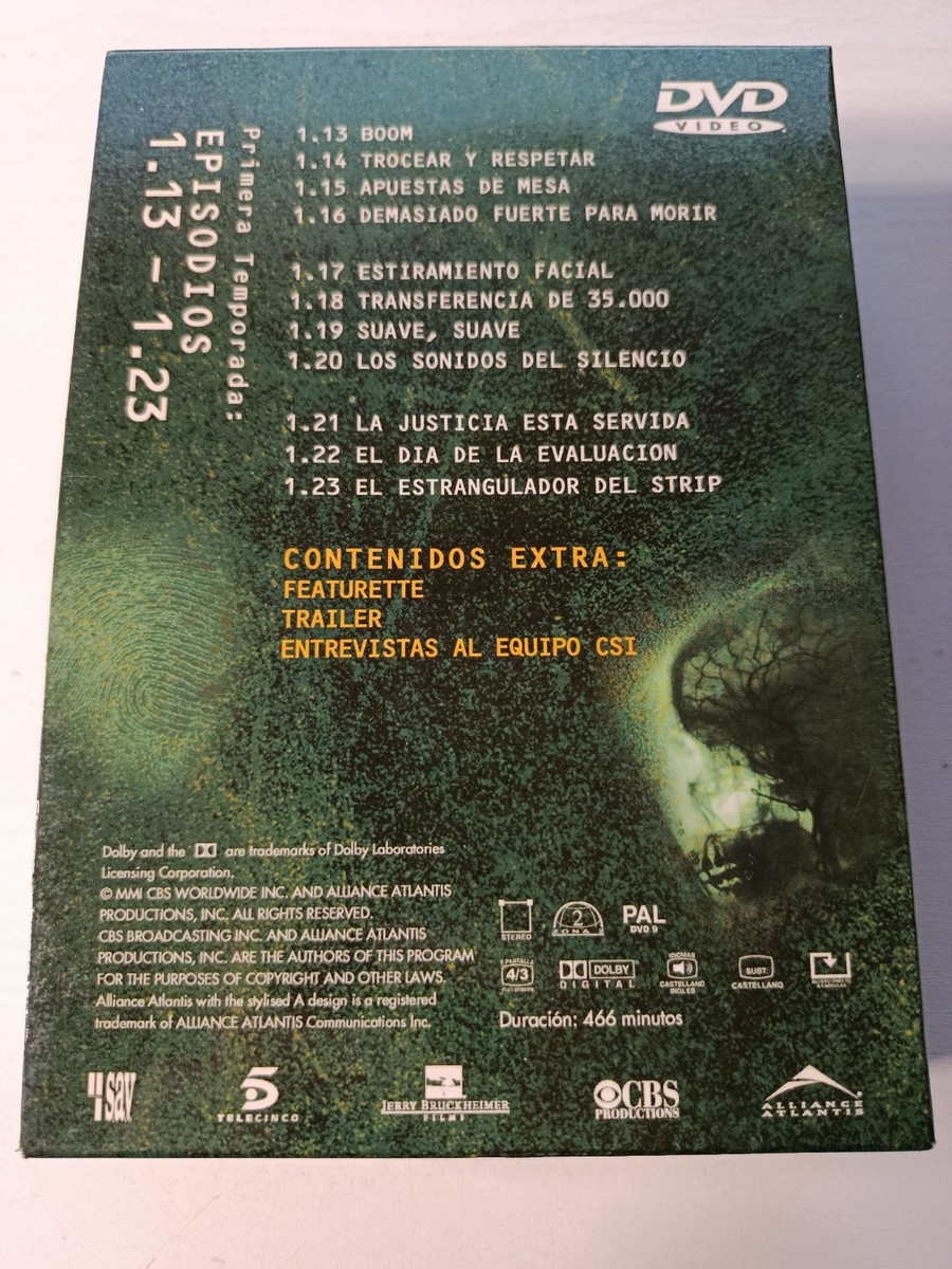 Second half de the first season de CSI Las Vegas, episodes 1.13 to 1.23. Audio in Spanish and English, 4:3 format, subtitles in Spanish. Region 2 PAL. Includes extra content: featurette, trailer and interviews with the team. Total duration 466 minutes. Distributed by SAV.