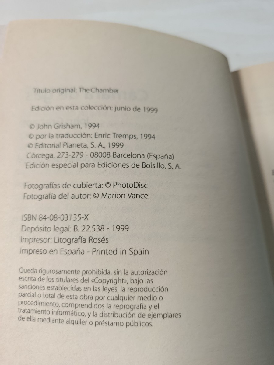 Spanish edition de the successful novel de John Grisham de Chamber (also published como Sealed Chamber), in de format Booklet 1999. An essential work del master del judicial thriller, whereel suspense and tension intertwinecon topicsdejusticia and morality.