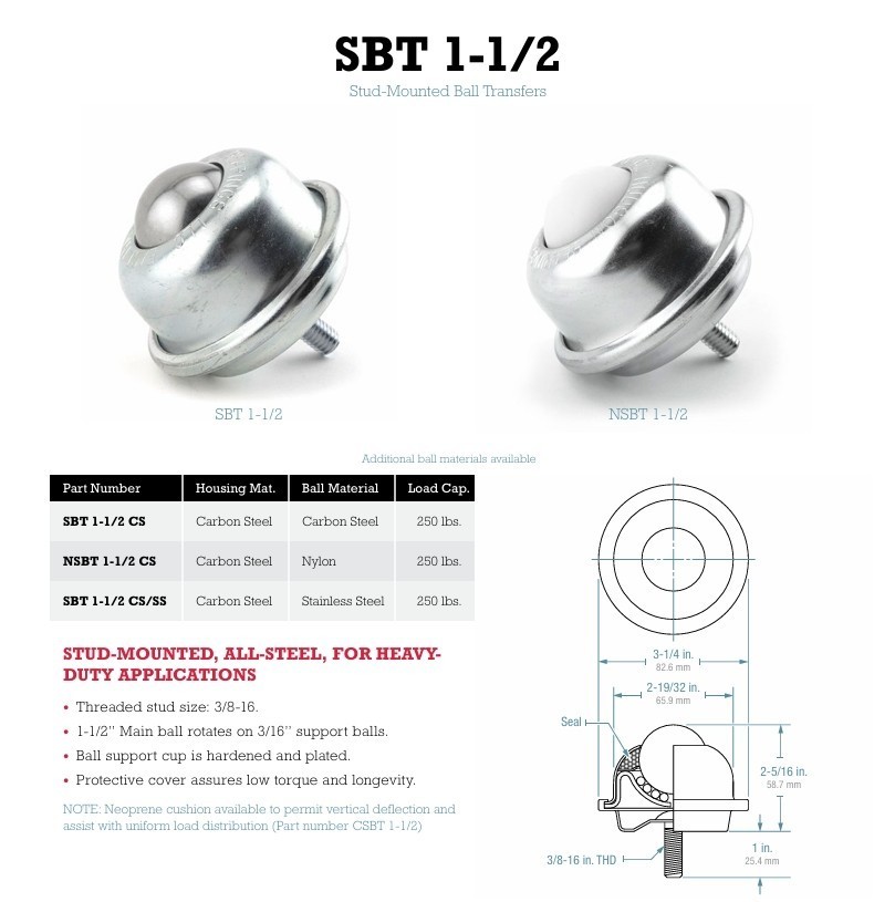 Many material handling conveyor systems require specific mechanical components that must be specially tailored and configured to the products that are being transferred. Our stud-mount ball transfer units can be configured to fit a new system or be retro-fitted to meet the needs of a pre-existing conveyor system.