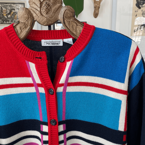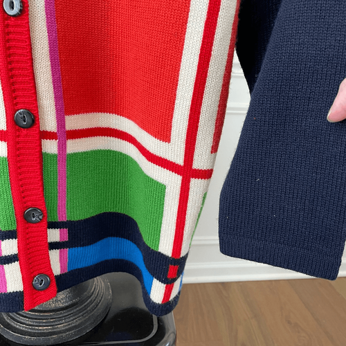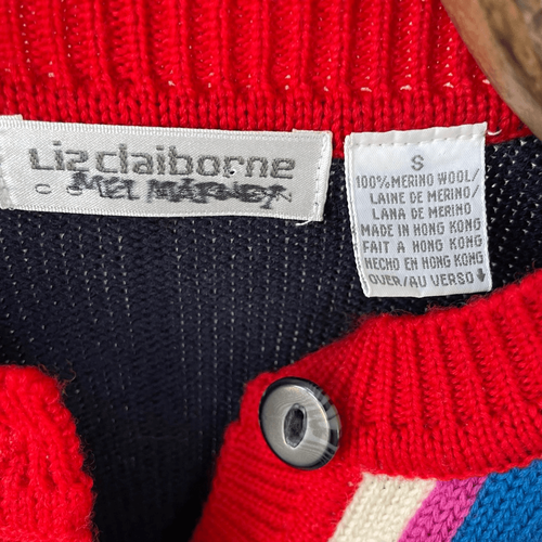 Vintage 80s or maybe early 90s Liz Claiborne bold color block plaid 100% merino wool button front cardigan. The back and sleeves are navy blue. The plaid is fun and bold shades of red, blue, magenta, Kelly green, and ivory. Laying flat measures 29 inches shoulder to hem and 20 inches armpit to armpit. Tag size small, so this is an oversize fit. No noted flaws, but please note there is a name printed on the brand label