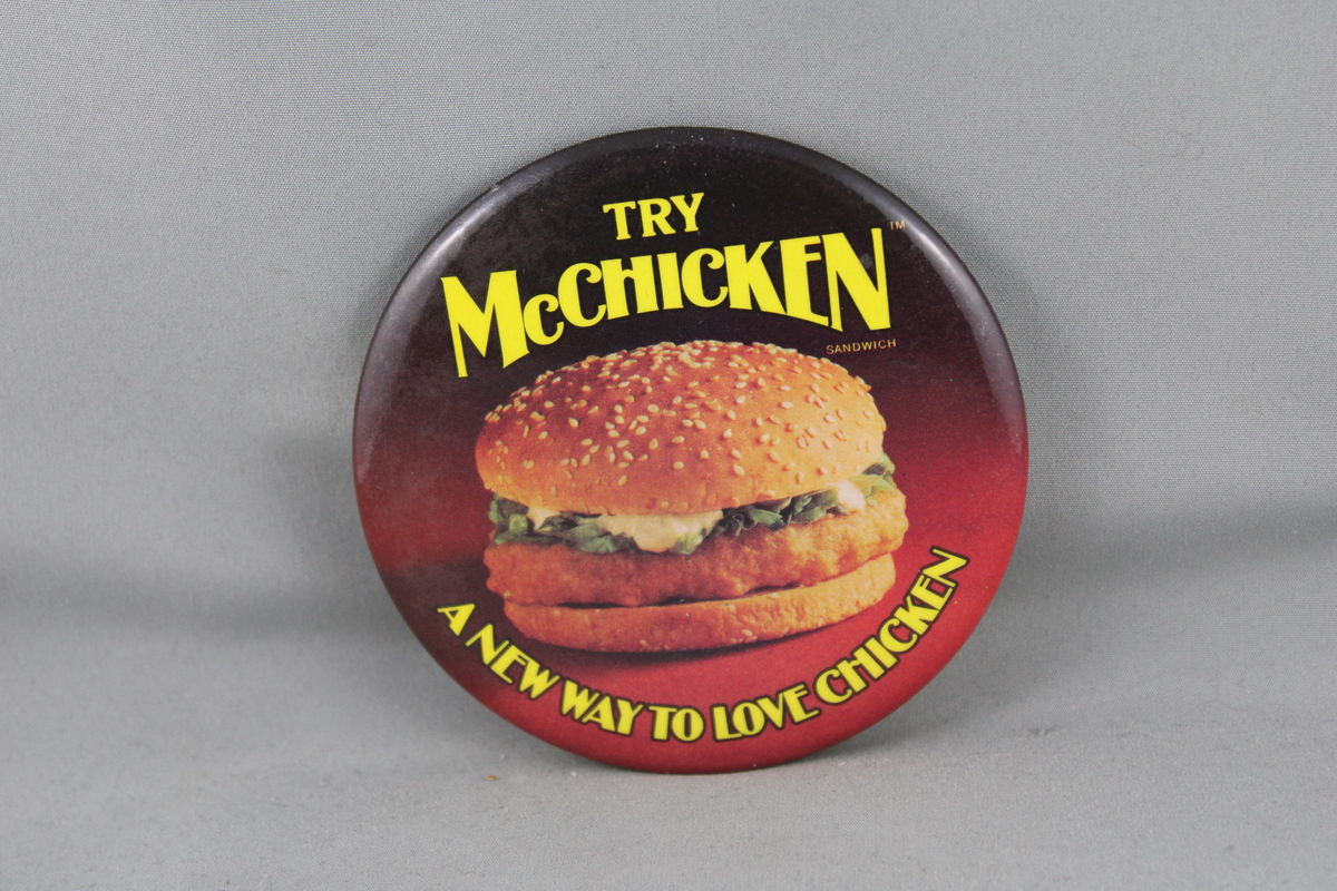 Up for sale is a vintage McDonald's pin. It has a red base colour with a photo picture of a McChicken sandwich in the middle. Around the picture, try McChicken a new way to love chicken is screened on. What a great pin do not miss out on it.