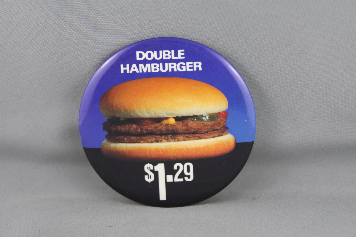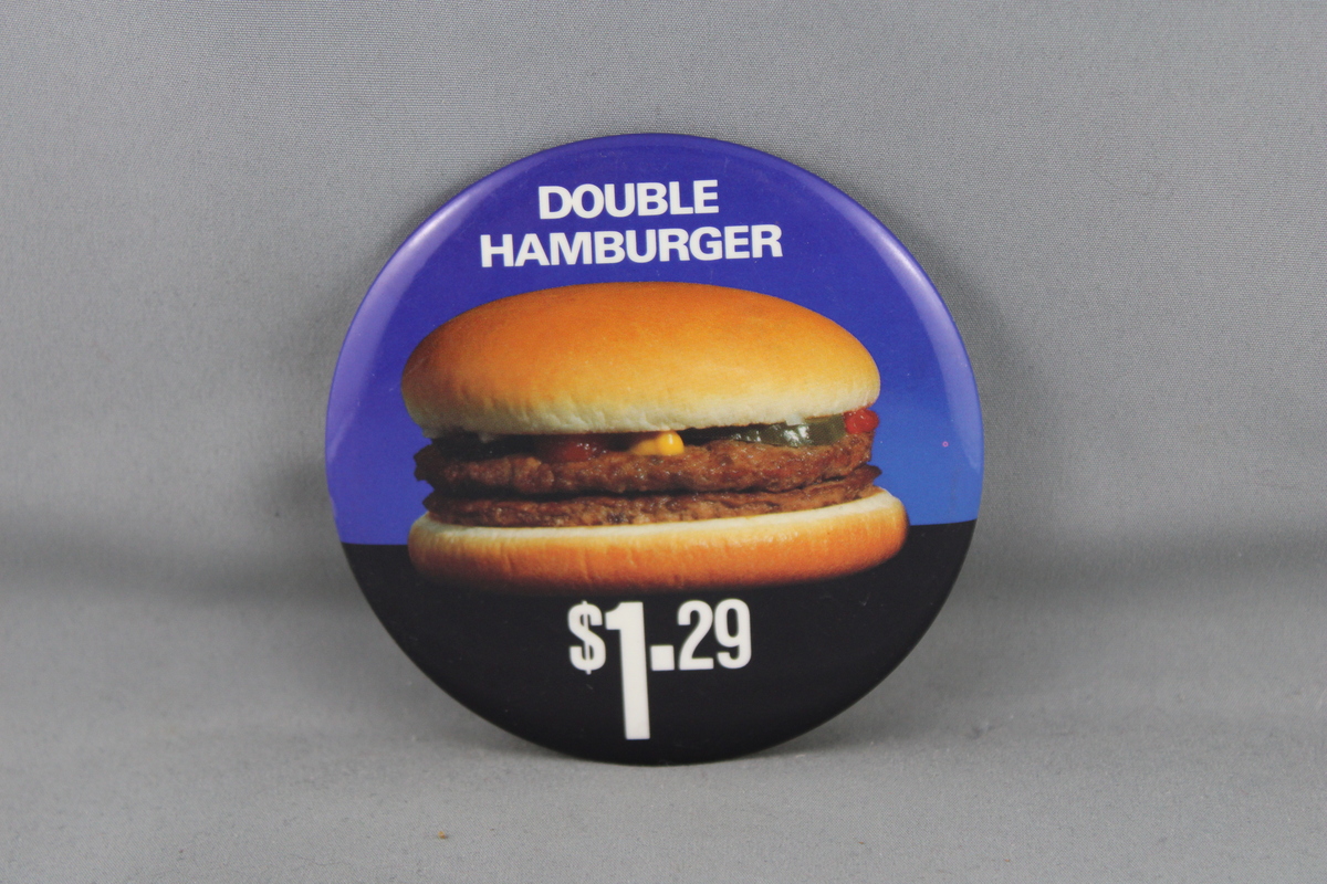 Up for sale is a McDonald's pin. It has a blue base colour with a photo picture of a double hamburger in the middle. Around the pin double hamburger 1.29 is screened on. What a great pin do not miss out on it.