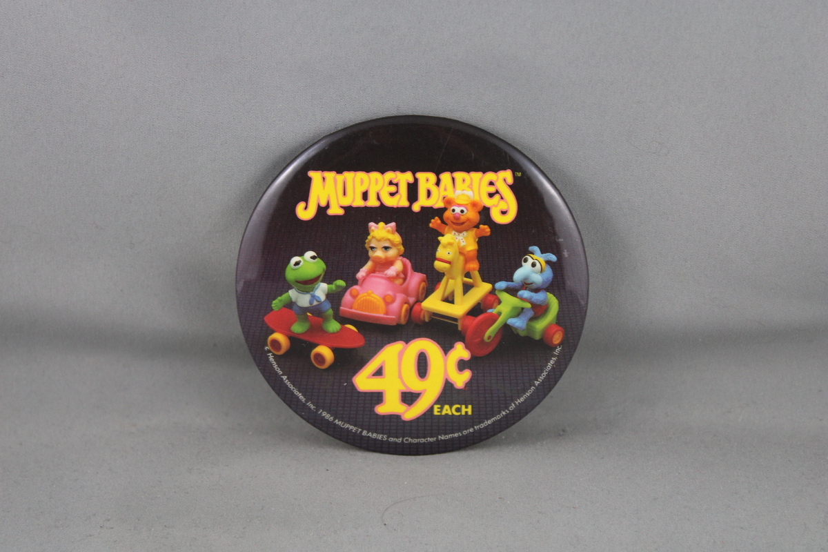Up for sale is a vintage McDonald's pin. It has a black base colour with a photo of the Muppet Baby Racers in the middle of the pin. Above the graphic Muppet Babies is screened on with 49 cents underneath. What a great pin do not miss out on it.