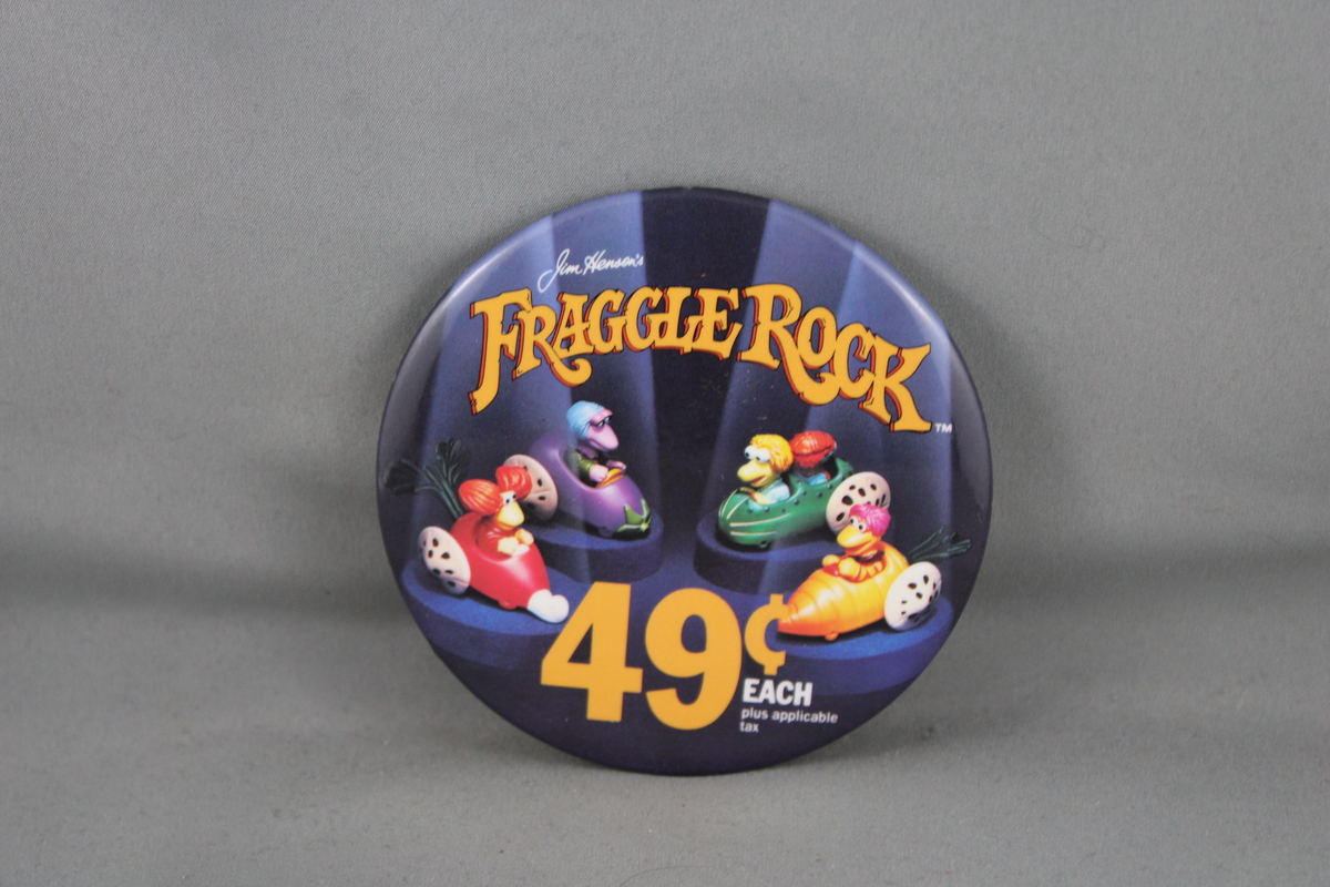 Up for sale is a vintage McDonald's pin. It has a grey base colour with a photo image of the Fraggle Rock Racers in the middle of the pin. The top of the pin has Faggle Rock screened on with 49 cents screened on the bottom. What a great pin do not miss out on it.