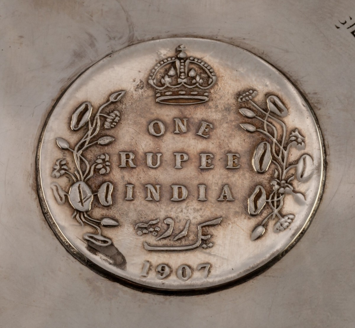 Features original Coins at Center of each dish. First dish contains a 1877 One Rupee India-British Coin showing Queen Victoria on one side and value within wreath on the other. Second dish is a 1907 India-British One Rupee coin with King Edward VII.