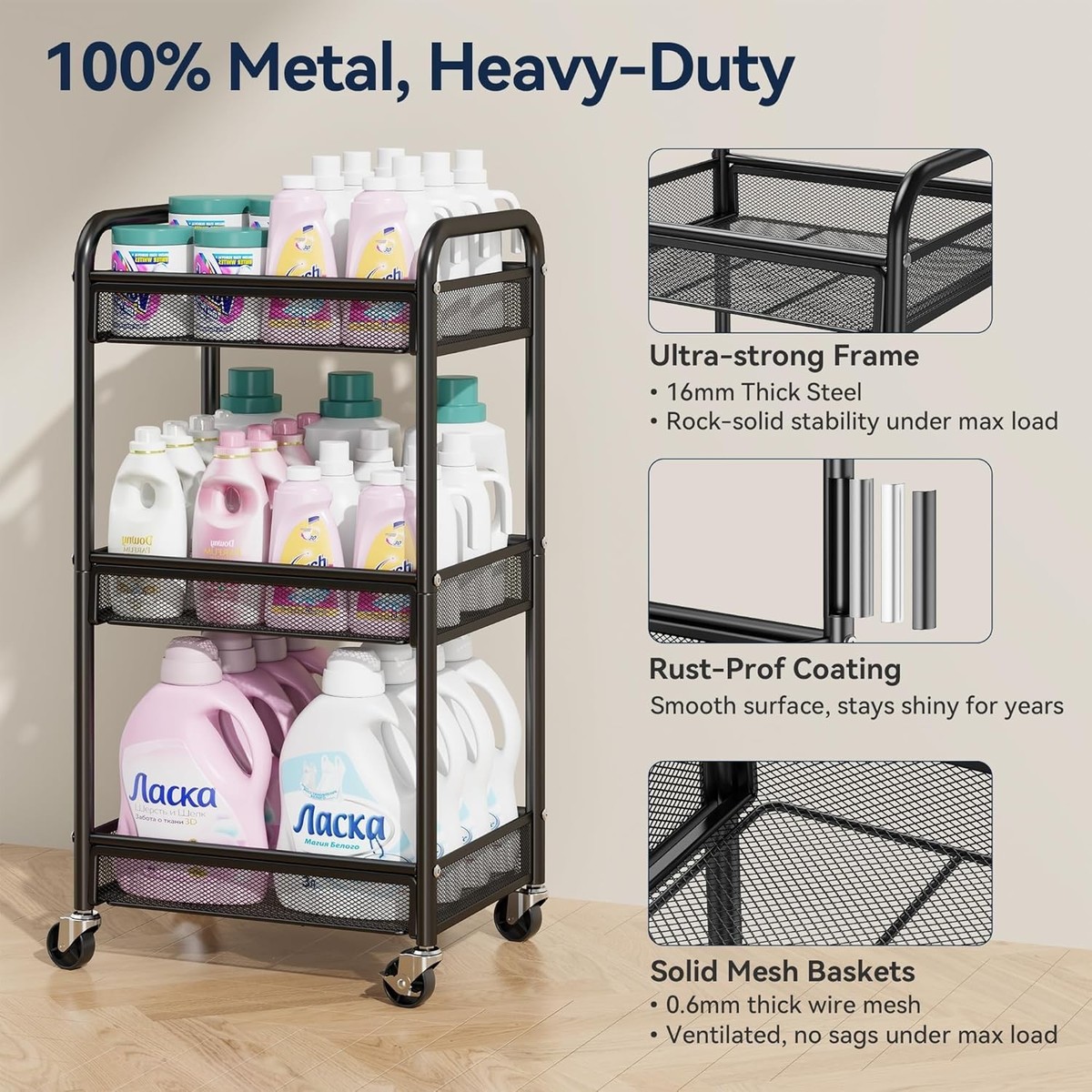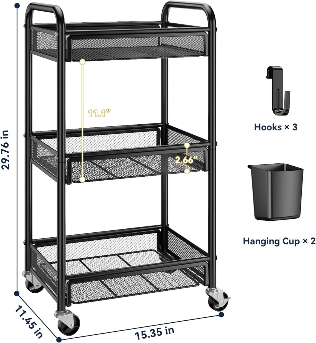 Durable 3-Tier Rolling Cart for Home & Office – Includes Hooks & Hanging Cups
