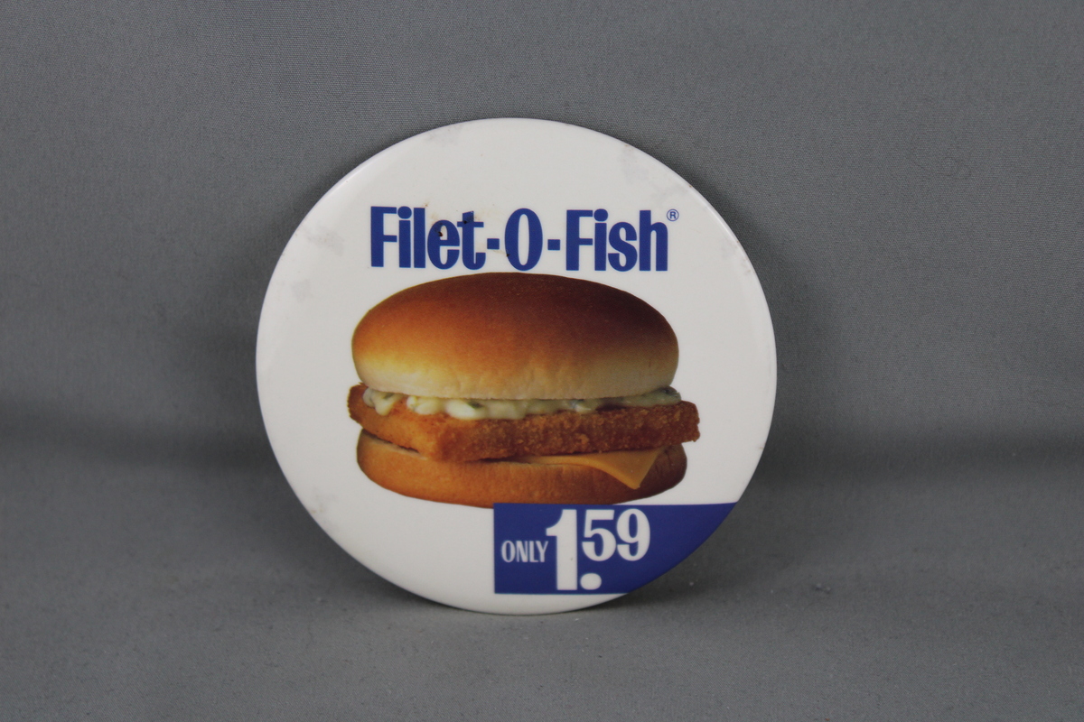 Up for sale is a vintage McDonald's pin. It has a white base colour with a photo image of a Filet-O-Fish in the middle of the pin. Filet-O-Fish is screened on top with 1.59 underneath. What a great pin do not miss out on it.