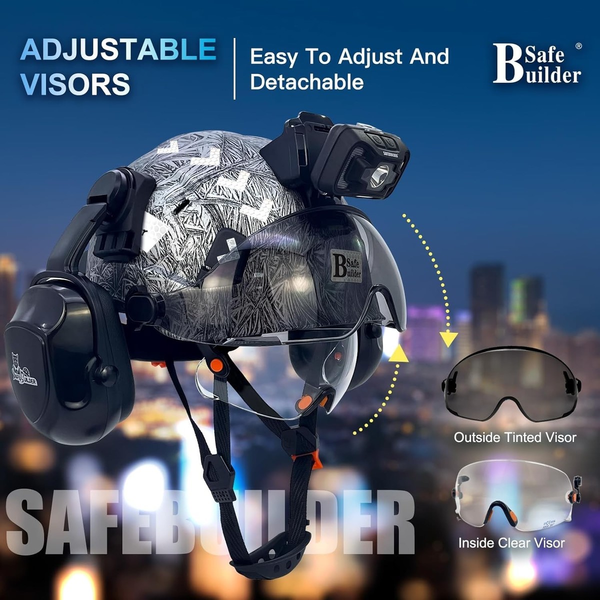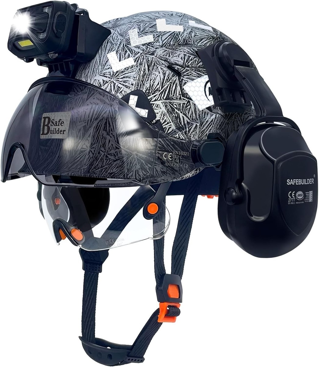 ? Accessories Included: This hard hat comes with mountable ear muffs for hearing protection, an integrated headlamp, and safety visors (both clear and tinted options available) to ensure visibility during day and night work.