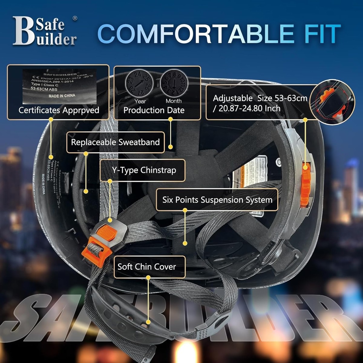 ? Comfortable Fit: Equipped with a visor and integrated headlamp, this hard hat features ear muffs and a 6-point suspension system to absorb shock impacts during hazardous work situations. The Y-type chinstrap ensures a secure fit, adjustable to provide optimal comfort. Fits head sizes from 53-63cm (20.87-24.80 inches).