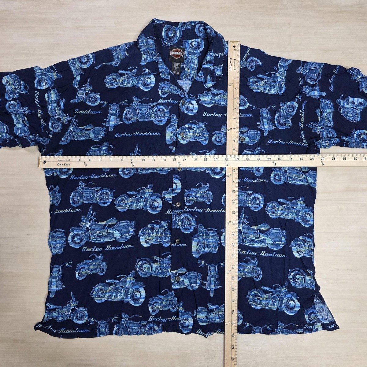 Color: Navy blue base with light/medium blue all-over motorcycle and Harley-Davidson script print