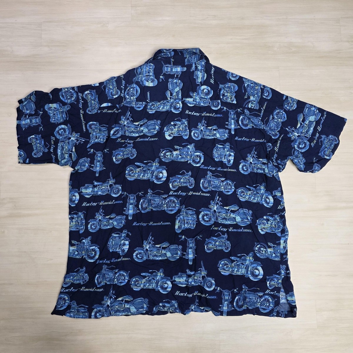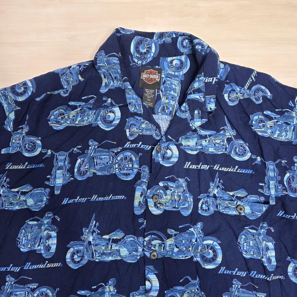 Harley-Davidson Shirt Mens 2XL Navy Blue Hawaiian Aloha Camp Button Up Made USA