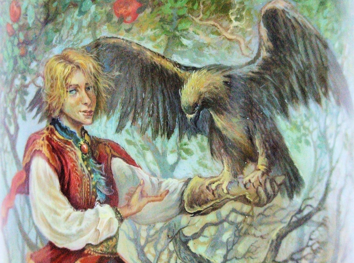 declared that whoever made him a ship that could sail through the air would marry his daughter. The older two set out, with everything their parents could give them; then the youngest set out as well, despite their ridicule and being given less fine food. He met a little man and, when the man asked to share, he hesitated only because it was not fit. But when he opened it, the food had become fine. The man told him how to strike a tree with an axe; then, he was not to look at it but fall to his knees. When he was lifted up, he would find the tree had been turned into a boat, and could fly it to the Tsar's palace, but he should give anyone who asked a lift. He obeyed. On the way, he met and gave a lift to a man who was listening to everything in the world, a man who hopped on one leg so that he would not reach the end of the world in one bound, a man who could shoot a bird at a hundred miles, a man who needed a great basket of bread for his breakfast, a man whose thirst could not be sated by a lake, a man with a bundle of wood that would become soldiers, and a man with straw that would make everything cold. At the Tsar's place, the Tsar did not want to marry the princess to a peasant. He decided to send him to the end of the world to get healing water, before the Tsar finished his dinner. But the man who could hear heard him and told the youngest son, who lamented his fate. The fleet-footed man went after it. He fell asleep by the spring, and the huntsman shot the tree he was leaning against to wake him up, and he brought back the water in time. The Tsar then ordered him to eat twelve oxen and twelve tons of bread, but the glutton ate them all. The Tsar then ordered him to drink forty casks of wine, with forty gallons each, but the thirsty man drank them all. The Tsar said that the betrothal would be announced after the youngest son bathed, and went to have him stifled in the bath by heat. The straw cooled it, saving him. The King demanded that he present him with an army on the spot, and with the wood, the youngest son had it and threatened to attack if the Tsar did not agree. The Tsar had him dressed in fine clothing, and the princess fell in love with him on sight. They were married, and even the glutton and the thirsty man had enough to eat and drink at the feast.