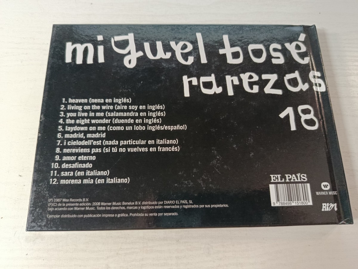 Miguel Bose, Rarities, livre CD, Warner 2008, edition speciale, collection, titres rares, versions en anglais, francais, italien, pop espagnole, musique des annees 80 90 2000, collection, CD rare, digibook, El País, collectionneur Bose, musique internationale