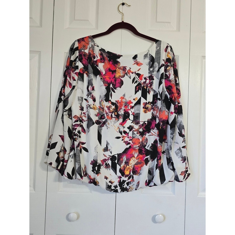 Alfani Womens Size 14 Abstract Floral Print Long Sleeve Scoop Neck Blouse White