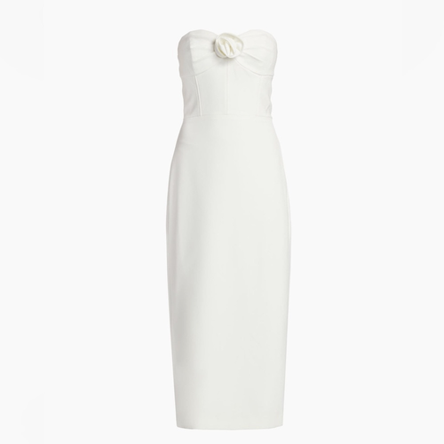 This timeless strapless midi is crafted from soft crepe and topped with a romantic rosette.