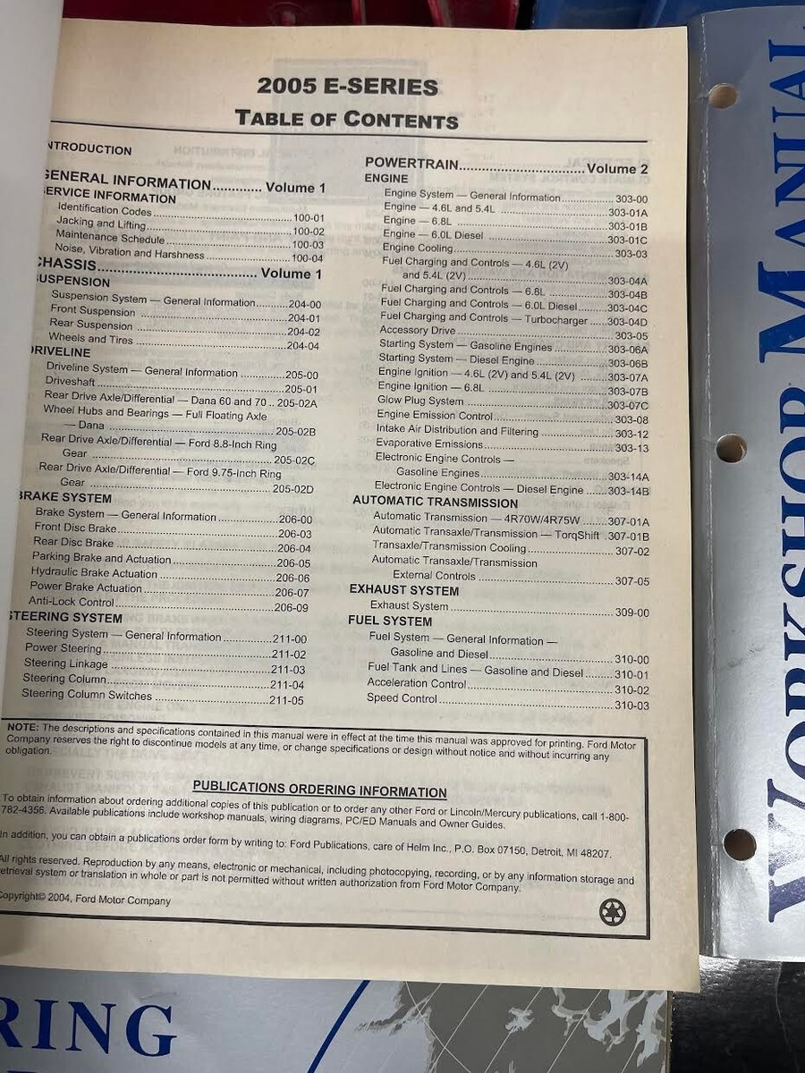 Manuale di servizio Ford serie E/Econoline 2005 in 2 volumi, manuale dello schema elettrico e manuale del propulsore diesel 6.0