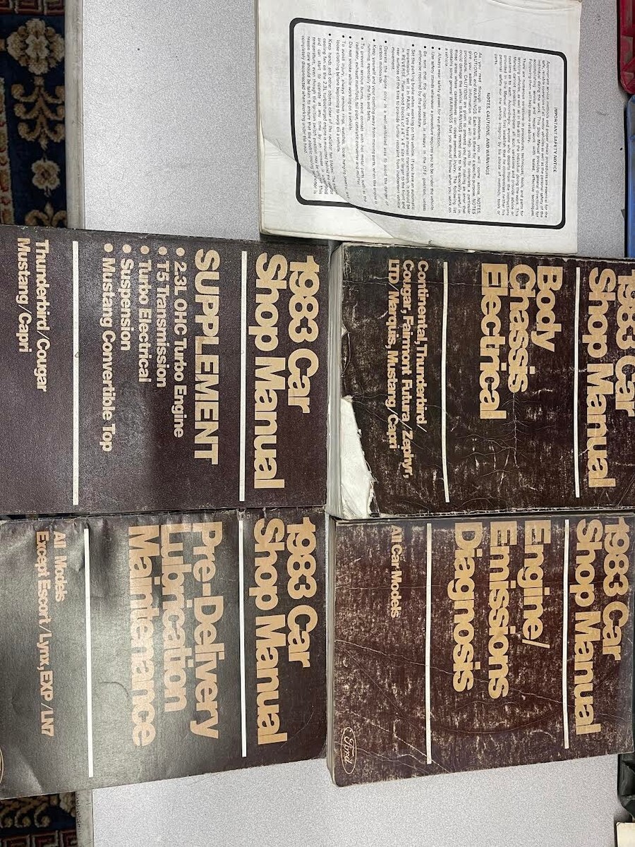 FACTORY 1983 Ford Mustang /Capri Factory carrozzeria/telaio/manuale di servizio elettrico, supplemento al manuale di servizio, manuale di pre-consegna, manuale dell'elettronica del motore di diagnosi delle emissioni, manuale del gruppo propulsore, manuale delle specifiche,