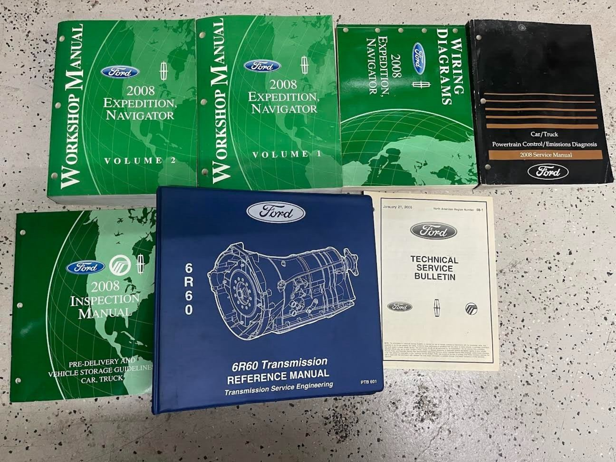 FACTORY 2008 Ford Expedition/ LINCOLN NAVIGATOR Manuale di servizio set di 2 volumi, manuale degli schemi elettrici, manuale di controllo del gruppo propulsore/diagnosi delle emissioni, manuale di trasmissione, manuale di ispezione e manuale del bollettino tecnico