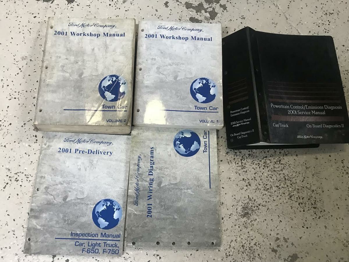 Manuale di officina Lincoln Town Car del 2001, set di 2 volumi, manuale dello schema elettrico, manuale di diagnosi delle emissioni di controllo del gruppo propulsore e manuale di ispezione
