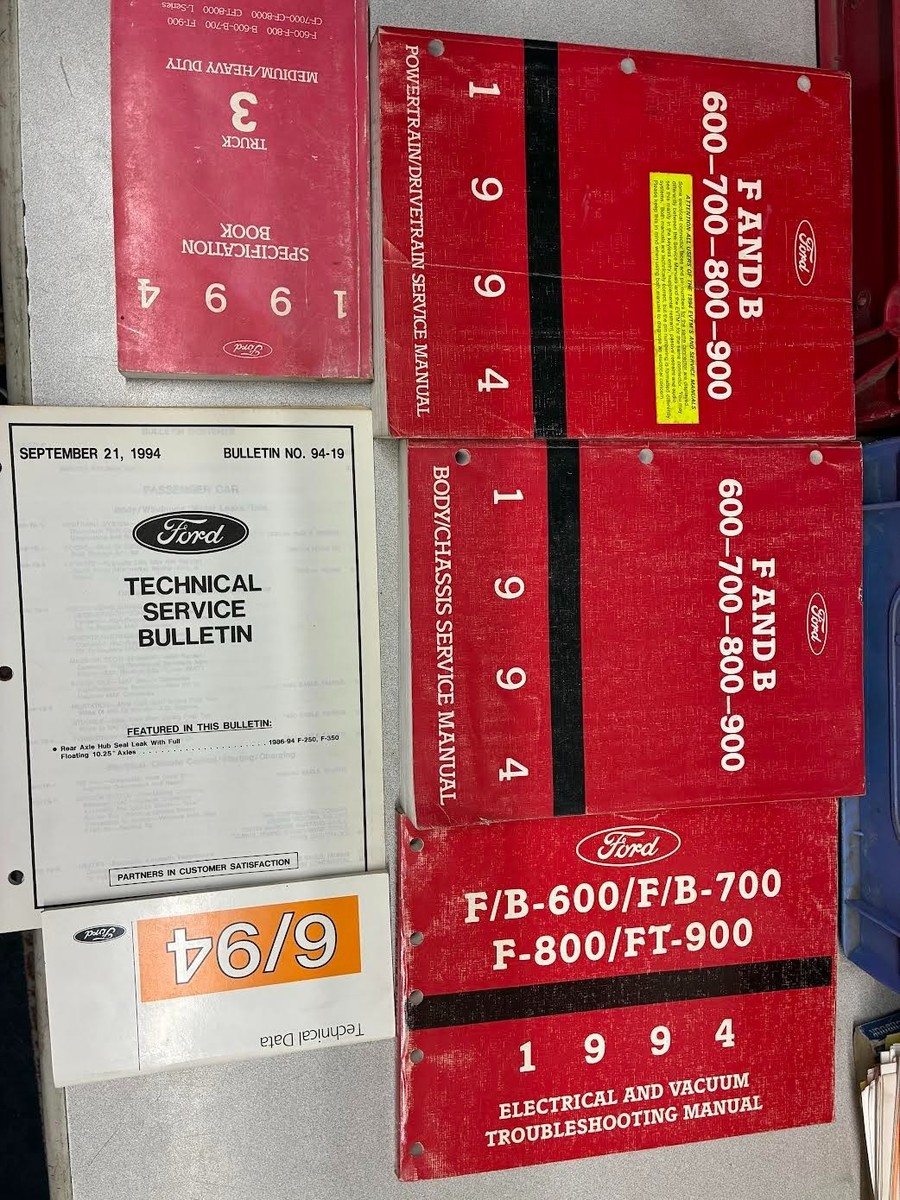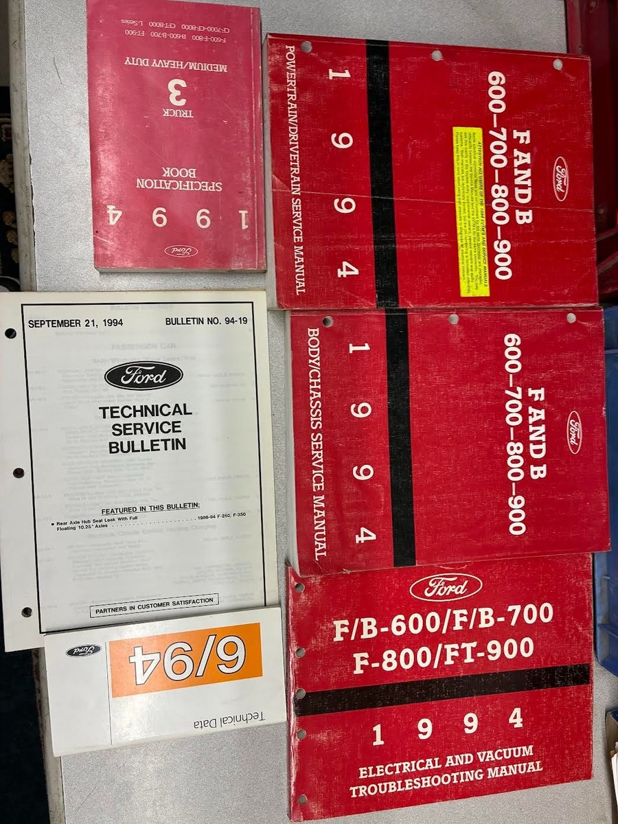 Manuale di servizio carrozzeria/telaio Ford F B 700-800-900 di fabbrica del 1994, manuale di servizio gruppo propulsore/trasmissione, libretto dei dati tecnici, bollettino tecnico, manuale per la risoluzione dei problemi elettrici e del vuoto e manuale delle specifiche.