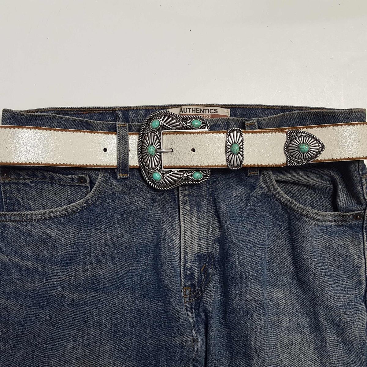 Vintage Leather Western Belt with Turquoise Stone Buckle Set White Turquoise Med