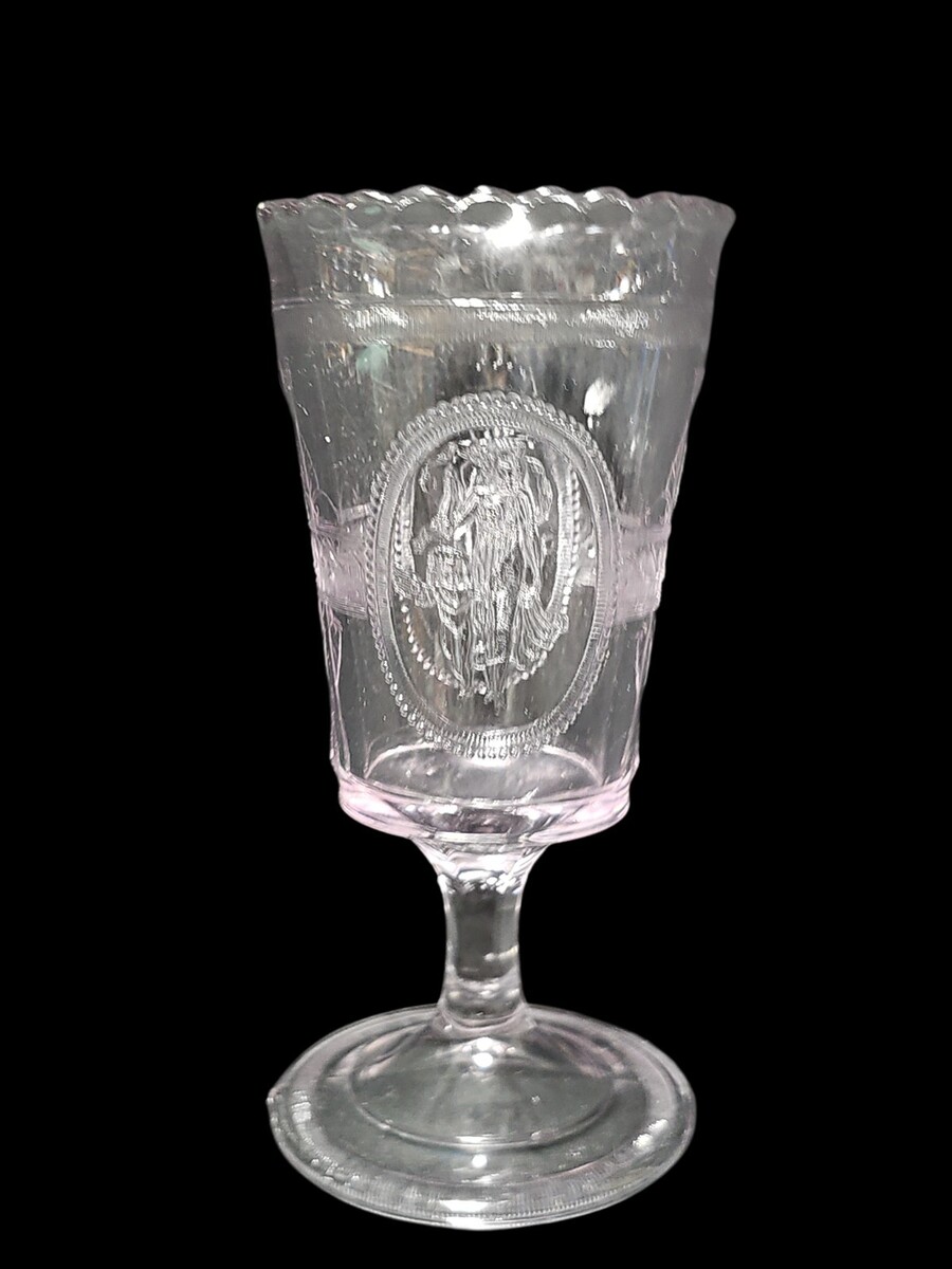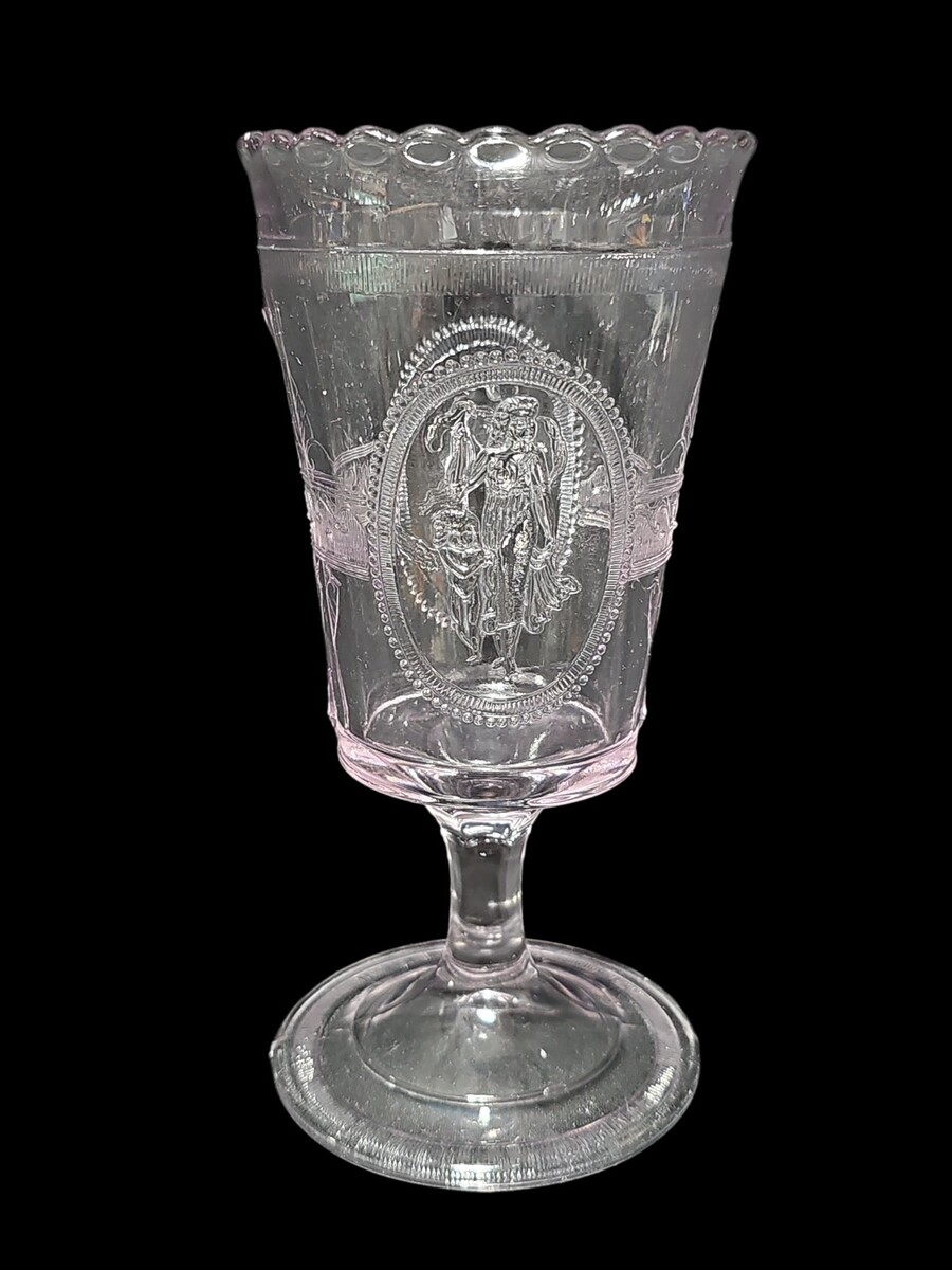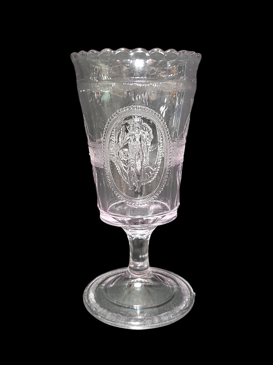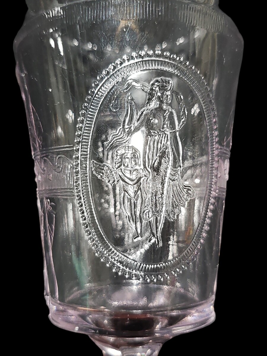 This pressed glass example displays crisp relief work, scalloped rim, pedestal foot, and classical figural detailing typical of late 19th century American pattern glass.