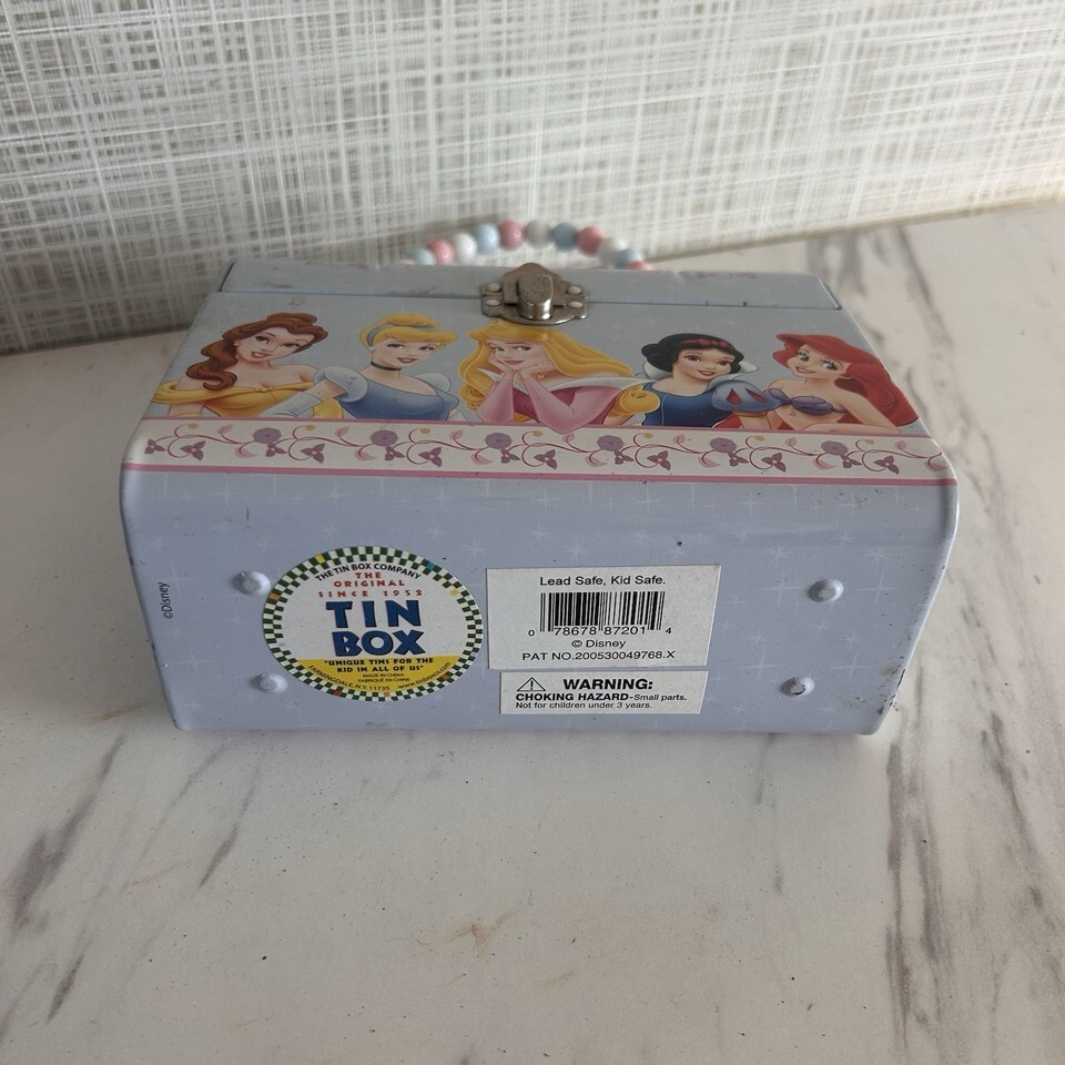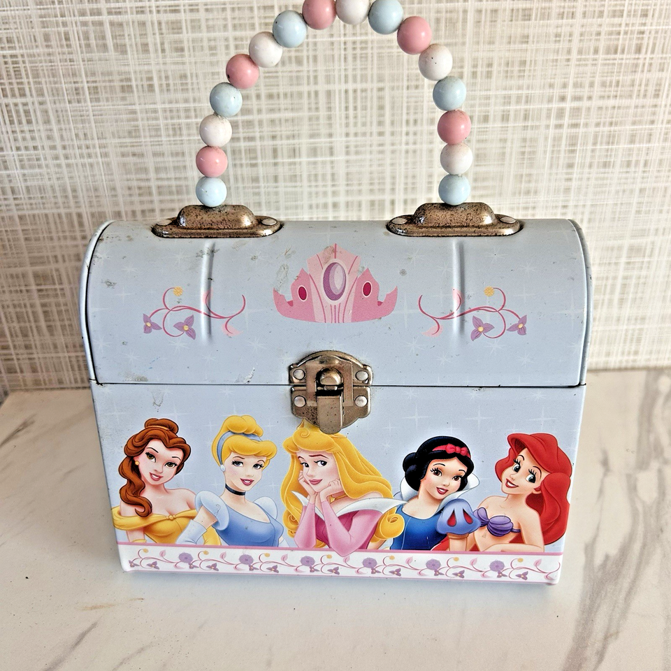 Disney Princess Small Tin Purse Handbag Lunchbox Blue Belle Aurora Ariel 6x7. Pre-owned acceptable condition. Some pitting. 2018.