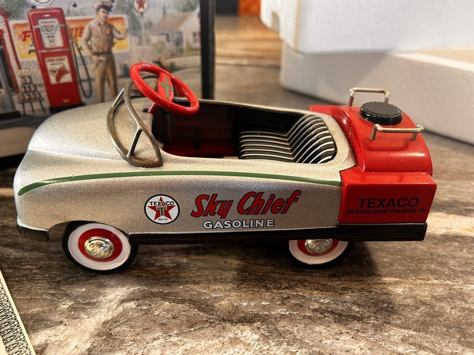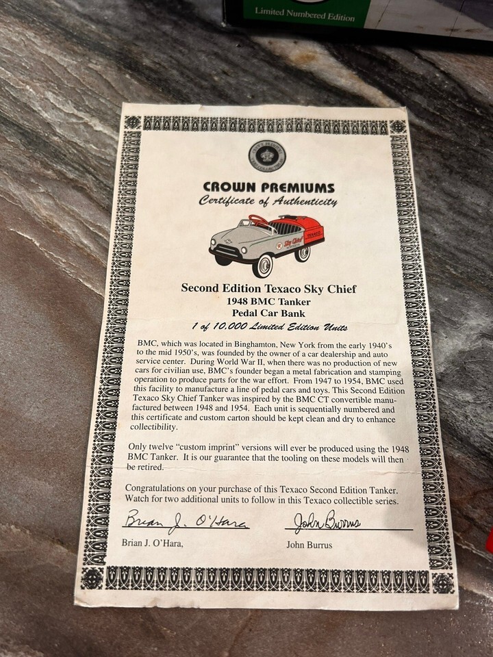 This diecast model of a BMC oil tanker is a Crown Premiums Texaco 1948 stock #48. It is the second in series and has a scale of 1:6. The model is made of high-quality materials and has a silver color. The vehicle make is BMC and the model is a pedal car. The year of manufacture is 1997 and the country of manufacture is China. The model is part of the Texaco Petroleum series and belongs to the character family of Texaco. This item is perfect for collectors and enthusiasts of diecast and toy vehicles.