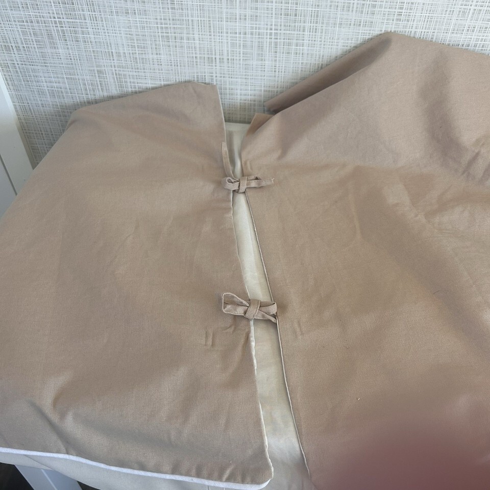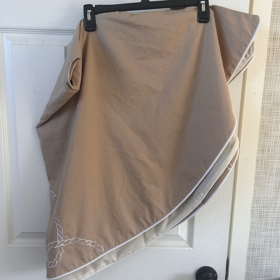 Unbranded cotton blend/linen tree skirt. Khaki/tan in color with colorful Sand dollar, sea horse and starfish appliques. Ties. Lined in lighter cream color. Excellent condition. 54".