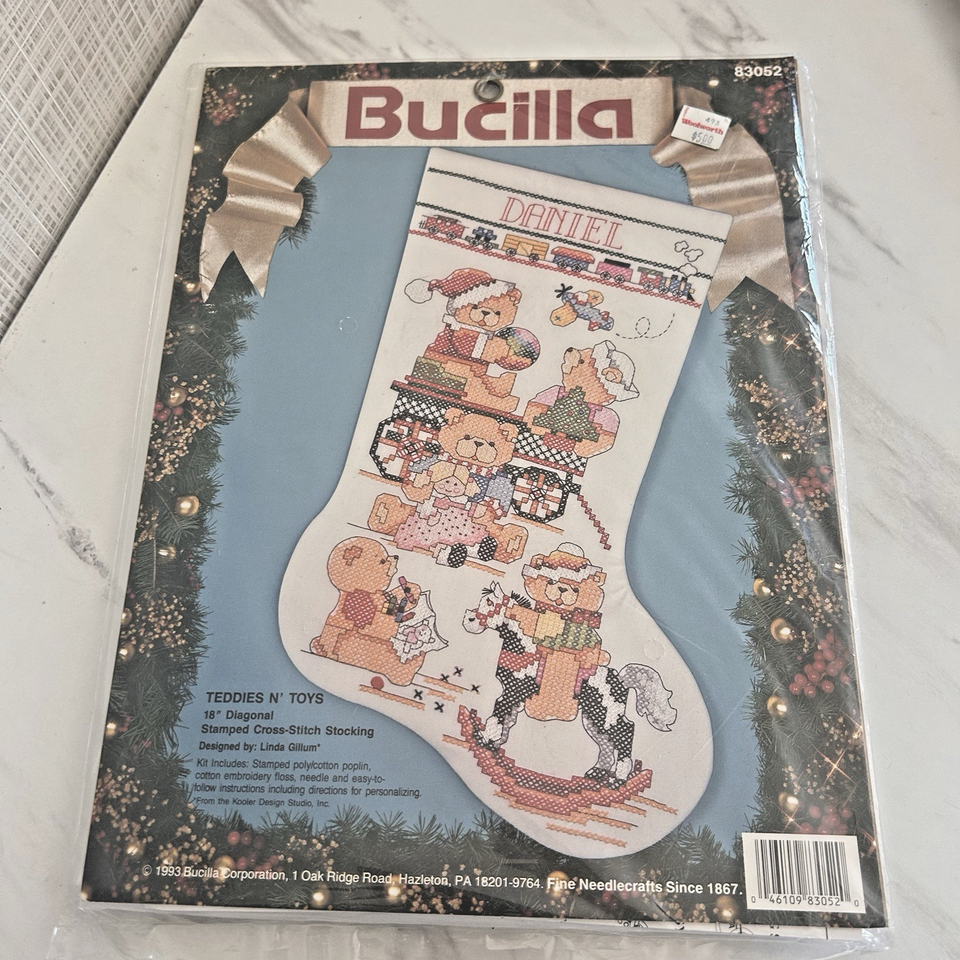 New, old stock, 1993. Bucilla vintage Christmas Teddies N Toys kit. The name "Daniel" is on the top of the stocking. Made in the USA. 18" Diagonal.