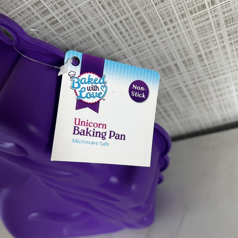 Baked with Love Silicone Nonstick Unicorn Baking Pan. Microwave safe, Oven safe up to 450 degrees, freezer safe. Can be used for baking a unicorn cake, ice mold, jello or candy mold. Purple. New, with tags.
