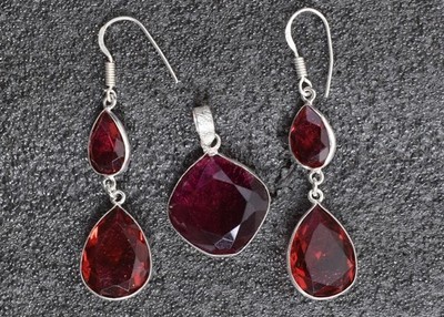 925 Sterling Silver Ruby Quartz Gems Handmade Pendant Earrings Her Party Gift's
