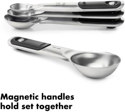 Stop digging through drawers for the right size. The OXO Good Grips 4-Piece Stainless Steel Measuring Spoons Set features magnetized handles that keep the spoons neatly nested for storage while allowing you to remove one spoon at a time with ease.