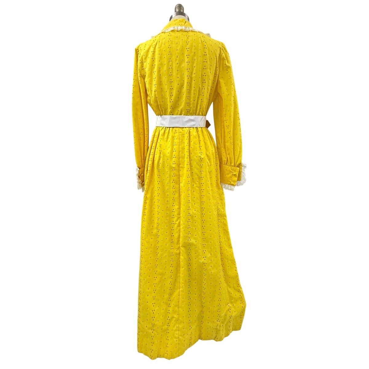 VTG 1970s Mollie Parnis Boutique Yellow Eyelet Maxi Dress Lace Collar M