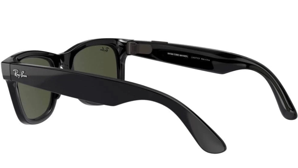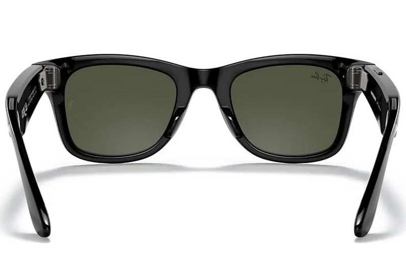 Ray-Ban Stories Wayfarer Smart Glasses in Shiny Black with Green G-15 lenses. This is the first-generation model developed in partnership with Facebook (Meta), designed to capture, share, and stay connected ? all in the classic Wayfarer style.