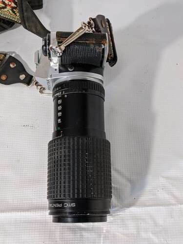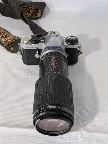 A vendre est un appareil photo Pentax ME Super 35 mm d'occasion avec teleobjectif SMC 70-210 mm 1:4, filtre et sangle. La camera presente de la rouille et des bosses en surface.